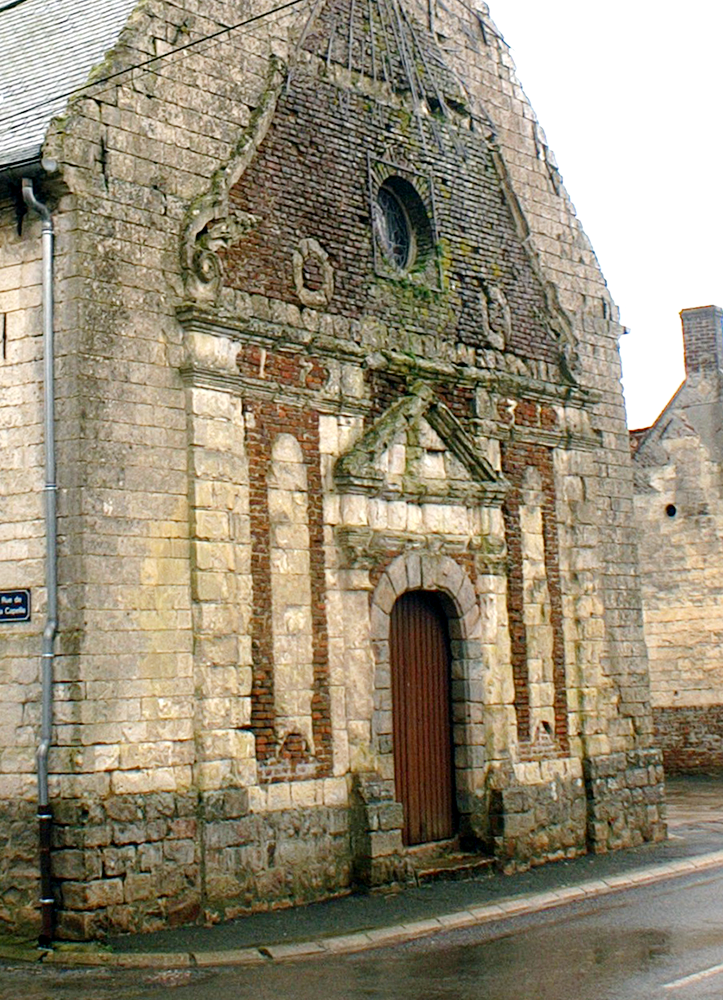 C’est la façade occidentale qui retient toute l’attention. La porte, au profil surbaissé, s’ouvre dans un encadrement de pilastres à chapiteaux composites, dérivés du ionique, supportant une architrave et un fronton triangulaire. Elle est encadrée de panneaux de briques décorés de tableaux de pierre découpés, et surmontée d’un large bandeau de briques portant la date de 1723, dessiné en pierre. Le grand pignon chantourné est doté d’enroulements latéraux, accompagnés de motifs de guirlandes. Sa partie haute a été maladroitement réparée, probablement en 1844, et dotée d’un oculus sans grand caractère.