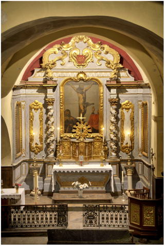 Chaque nef possède un retable. Celui de la nef nord est consacré à saint Sébastien, représenté en bas-relief dans un style très populaire. Celui de la nef sud, de style rocaille, est centré autour d’une toile représentant la Crucifixion, encadrée de colonnes torses ; sur les panneaux latéraux, deux autres toiles représentent saint Pierre et saint Paul.