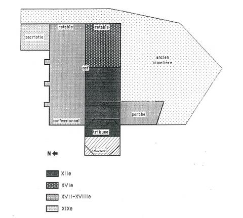 Dans un premier temps, le sanctuaire roman a été prolongé vers l’est, sans doute au XVIe siècle ; puis, au XVIIe s., l’édifice a été doublé par l’adjonction d’un deuxième vaisseau au nord. Les nefs se terminent par un chevet plat, pris extérieurement dans un mur-pignon unique. Au sud, perpendiculaire à la nef médiévale, une galerie-porche ouvre sur l’extérieur par trois grandes arcades. À une époque indéterminée, le clocher octogonal, percé d’ouvertures en plein cintre, a été implanté à l’ouest du vaisseau sud.