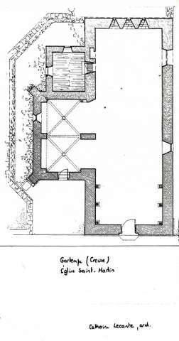 Cette église fort modeste (longueur totale 16,42 m, largeur intérieure de la nef 5,70 m) présente un petit vaisseau uniforme, sans fragmentation en travées, dont la partie orientale, terminée par un mur droit, sert de chœur. Un plafond lambrissé, refait encore à l’époque moderne, couvre le tout. Le chevet est éclairé par trois baies étroites et hautes, ébrasées presque uniquement vers l’intérieur, sans doute par mesure de sécurité. Une grande fenêtre moderne a été ouverte au sud. Une chapelle de deux travées a été accolée sur le flanc nord. Elle est couverte de croisées d’ogives reçues par des culots moulurés. C’était la chapelle des Bridiers, seigneurs de Gartempe ; leurs armoiries figurent sur une des clefs ; l’autre porte le monogramme du Christ. Cette chapelle seigneuriale bénéficie d’un accès particulier à l’ouest. La porte en plein cintre, ornée de moulures (XVIe s.), est surmontée d’une pierre sculptée arborant, sous une accolade, les armes des Bridiers ; un troisième écusson se trouve sur une pierre tombale au centre de la nef. À signaler aussi une litre funéraire peinte sur le mur de la nef à l’entrée du chœur (XVIIe s.). Une sacristie a été ajoutée à l’est de la chapelle.