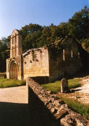 Dans le cas présent, l’édifice, bâti en belles assises régulières de calcaire, possède bien un triplet avec trois baies en ligne, ébrasées vers l’intérieur. L’arête de leur ébrasement intérieur est amortie de chaque côté par un tore formant une mince colonnette appareillée, surmontée d’un petit chapiteau allongé pris dans le bloc. Ce dernier s’applique sans tailloir à la partie inférieure d’une moulure en quart-de-rond intercalée à la naissance du plein cintre des trois baies. Deux autres baies semblables, mais sans bordure torique, se font face dans le tiers oriental des gouttereaux nord et sud. Ruinées, elles ont perdu le cintre qui les coiffait. De berceau, il n’y a pas de trace, mais les parties hautes ayant été refaites, on ne peut affirmer qu’il n’y en a jamais eu. Le mur ouest comprend une baie unique bouchée dans l’axe, semblable à celles de l’est, mais sans bordure torique, et une seconde baie plus petite surmontant la première dans la partie en moellon. L’ébrasement d’une porte médiévale se lit dans l’angle nord-ouest.