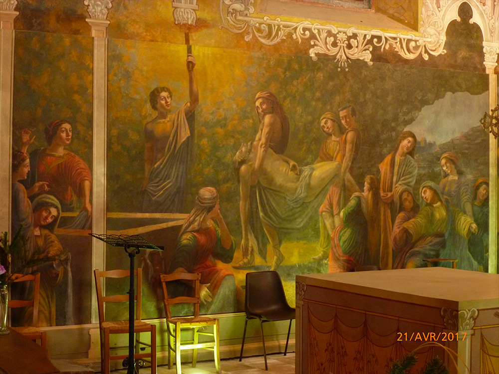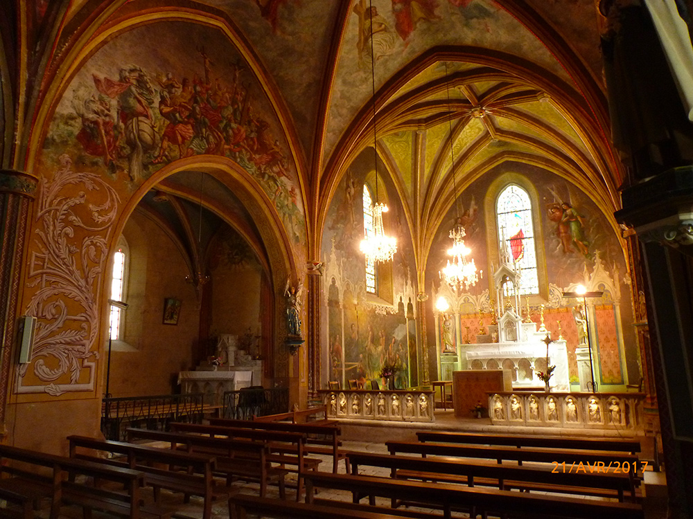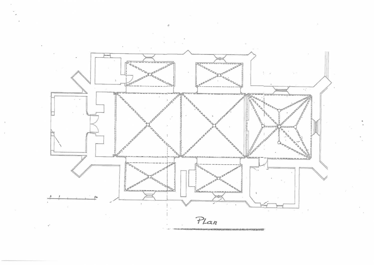 L’église est composée d’un plan rectangulaire avec une nef de deux travées voûtées d’ogives et une travée de choeur voûtée à liernes et tiercerons et à chevet plat.