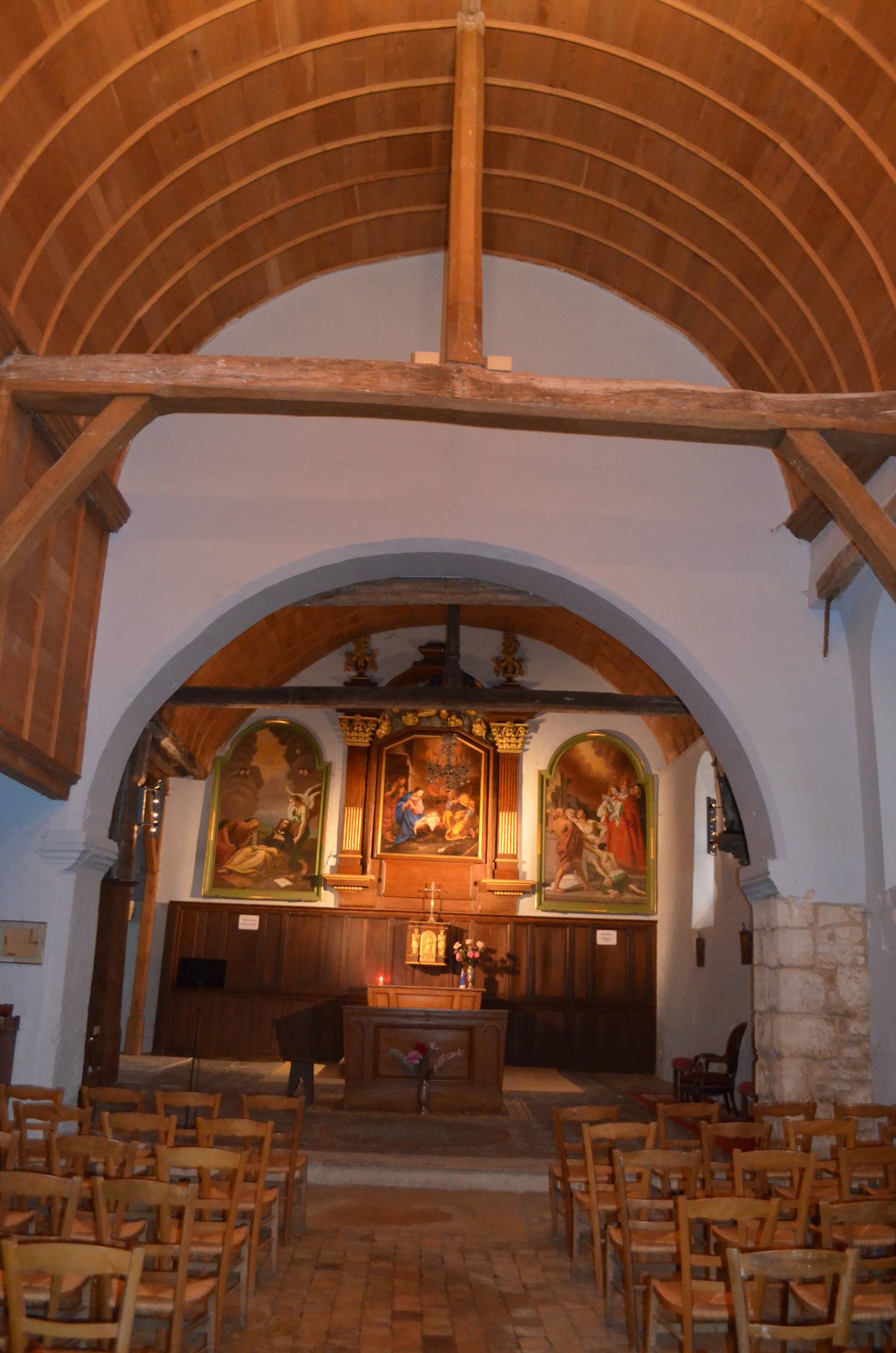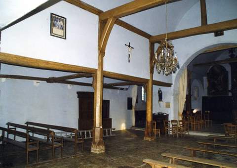 À l’intérieur, le rez-de-chaussée du clocher sert de chapelle des fonts baptismaux. Il est relié à la vaste chapelle nord du chœur par un étroit collatéral curieusement construit en pans de bois du côté de la nef. Les poteaux de chêne à pans coupés sont soigneusement moulurés tout comme les sablières qu’ils soutiennent. En partie haute, un cloisonnement sépare la nef du bas-côté pour masquer la différence de hauteur des couvrements. Tandis qu’un inattendu plafond plat a été posé sur la chapelle nord, des fausses voûtes en plâtre couvraient la nef, le chœur et le collatéral. Ce pseudo voûtement de la fin du XIXe s. se combinait maladroitement avec les entraits et poinçons de la charpente restés apparents. Les travaux récents, subventionnés par la Sauvegarde de l’Art français, ont restitué dans son état d’origine le lambris de couvrement. Des vestiges des matériaux anciens heureusement retrouvés sous la fausse voûte ont permis une réfection à l’identique, en planchettes de chêne avec couvre-joints moulurés. L’intérieur a ainsi repris sa cohérence structurelle.