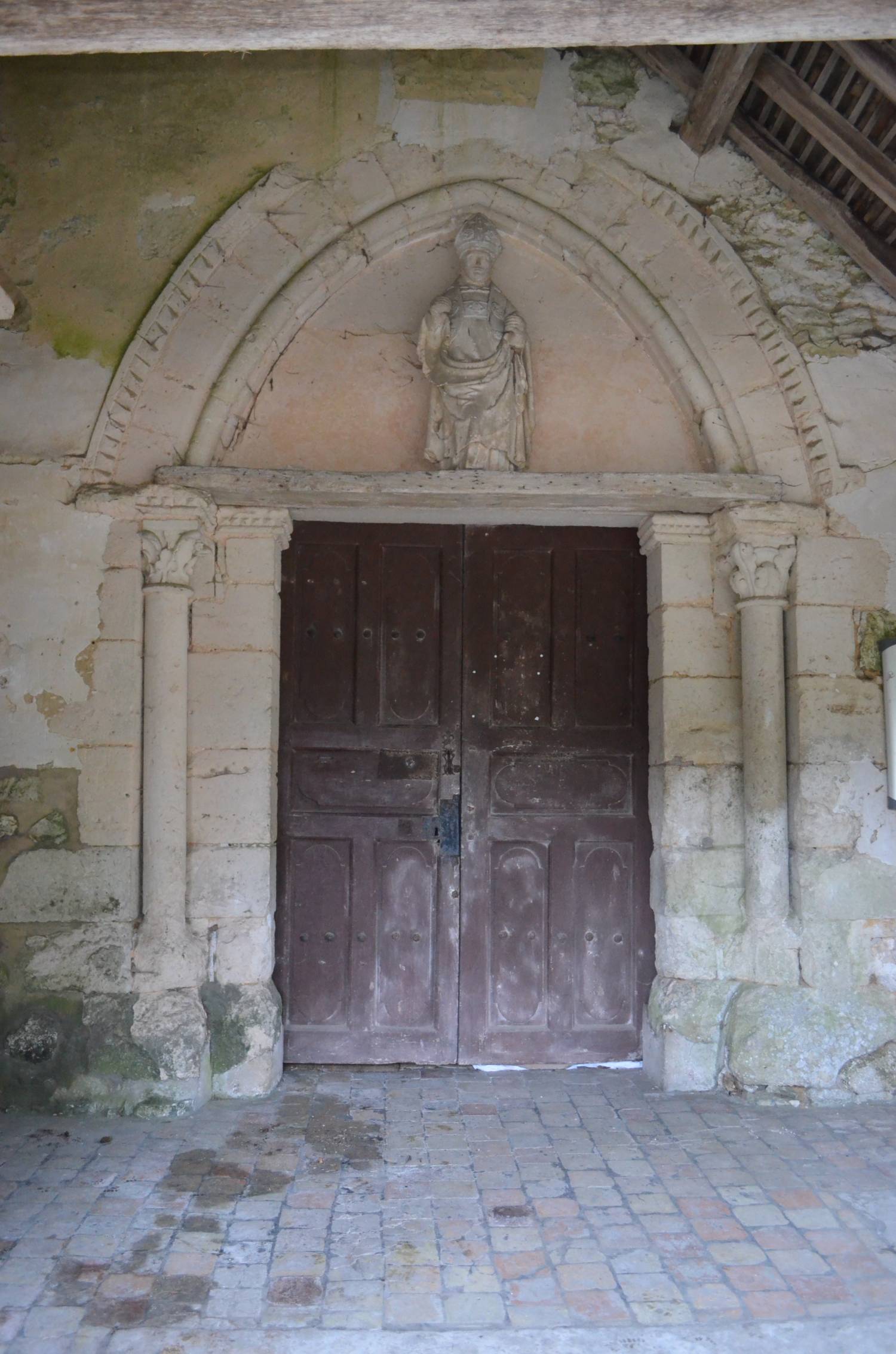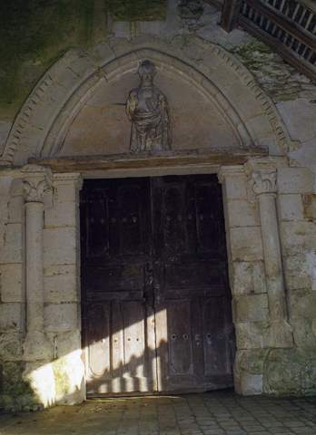 Entourée de son cimetière ancien, l’église est construite en moellons et couverte de tuiles plates. Elle s’élève juste au bord d’une rue en pente, sur une terrasse à laquelle on accède à droite par une rampe, à gauche par un escalier de pierre. Le petit parvis est bordé d’un muret de calcaire sur lequel sont posés les courts poteaux de bois moulurés qui soutiennent le porche surélevé, joliment bâti en charpente. Adossé dans l’angle formé par la façade ouest et le clocher, ce porche protège un portail gothique de belle facture construit en calcaire et ouvrant sur la nef. Bien que dégradé par l’usure du temps dans les parties basses, ce portail est encore très intéressant : les piédroits doublés de colonnettes à chapiteaux sculptés de feuilles d’eau et de trèfles soutiennent un tympan en arc brisé bordé d’un gros tore et, sur l’extrados, d’un rang de pointes de diamants. Ce dernier motif orne également les tailloirs. À gauche de la façade, le clocher est très caractéristique du XVIe s. avec son haut toit en pavillon couvert d’ardoises au-dessus d’une corniche en quart de rond. Aux angles, ses contreforts jumelés en équerre, sont soigneusement appareillés en calcaire et munis de larmiers. Sur la face nord, un modillon en remploi représente un visage féminin. On peut encore observer, sur les murs du chœur et de sa chapelle, d’anciens appareillages de fenêtres ; entre les contreforts du mur nord, les arcs bloqués au mortier sont particulièrement intéressants.