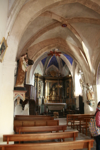 Le mobilier est réduit. Le retable du maître-autel a été réalisé au XIXe s. grâce à la participation financière d’Antoine Malac (inscription) et avec intégration d’éléments plus anciens. Il est orné des trois statues en bois doré de la Vierge (sur le tabernacle), de saint Jean-Baptiste et de saint Vincent diacre. Celui-ci ayant été peut-être mal identifié, sous sa dorure, on a placé au milieu de la nef une version sulpicienne du même saint protecteur des vignes et des vignerons, avec pour attribut une grappe de raisin. On trouve deux tableaux, datés de 1851, du peintre de Rodez, Jean-Baptiste Delmas, l’un au maître-autel (Ascension de Notre-Seigneur) et l’autre dans la chapelle Sainte-Anne (Sainte Anne et la Vierge). Une peinture murale assez dégradée (XIXe s. ?) figure le Christ au Jardin des Oliviers et pourrait être un rappel de la fondation que fit Hugues d’Hébrard de Saint-Félix en l’honneur de la Passion (1554). Le clocher renferme trois cloches, fondues en 1826 (Notre-Dame et saint Vincent), 1836 (Saint Vincent, portant cette inscription insolite : CLOCHE DE SEAINT VEAINSAN) et 1896 (Sainte Anne). L’objet le plus précieux de l’église est une belle croix de procession couverte de feuilles d’argent, attribuée à Jean Chavagnac, orfèvre de Rodez, du milieu du XVe s. (cl. MH 1938) ; elle est conservée aujourd’hui à Rodez.