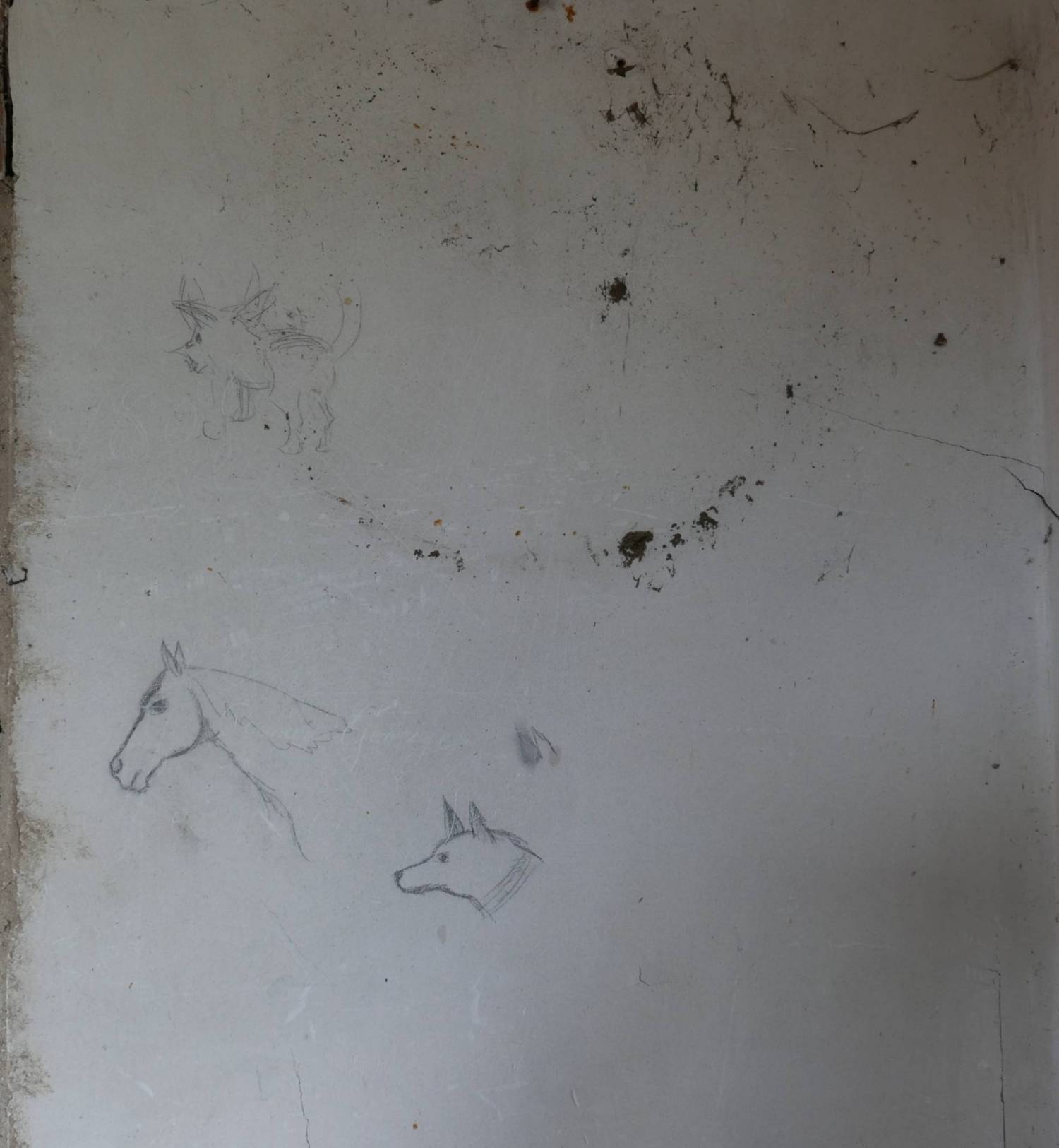 Le fantassin du 208ème régiment, lui, est accompagné d’un profil de la femme qui mérite également qu’on s’y arrête. La représentation féminine est omniprésente dans les productions littéraires et picturales des soldats. Souvenir de l’être aimé ou besoin affectif, ce couple nous émeut par le soin apporté au profil féminin. Le troisième panneau ne comprend que des animaux dont un cheval. La représentation de ce dernier montre l’importance de cet animal dans la Grande Guerre. Animal de traction, le cheval est omniprésent dans les lignes arrière où il a un rôle logistique et tactique essentiel pour l’armée française. Le départ ces animaux pour la guerre n’est pas un événement mineur : si le cheval est une force de travail essentielle de la Belle Époque, il est aussi le compagnon des agriculteurs. Cette complicité se retrouve dans les témoignages laissés par les soldats dont ce graffiti est un bon exemple.
