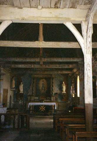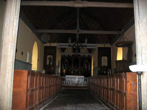 Le plan de l’édifice est composé de deux volumes rectangulaires, le chœur étant plus étroit que la nef ; la construction a été réalisée en moellons avec pierres de taille aux angles. Un élégant clocher à deux égouts retroussés vient coiffer en partie ouest la nef ; sa charpente fut refaite en 1776. La façade occidentale est percée d’une porte en anse de panier, surmontée de trois niches à décors feuillagés. Dans la niche centrale a été placé un groupe sculpté représentant la Charité de saint Martin. L’intérieur, à volume unique, a reçu une voûte lambrissée en berceau brisé, à épais couvre-joints. Une remarquable poutre de gloire porte un calvaire du XVe s. figurant des anges recueillant le sang du Christ. La partie ouest de la nef est occupée par le tabouret de clocher.
