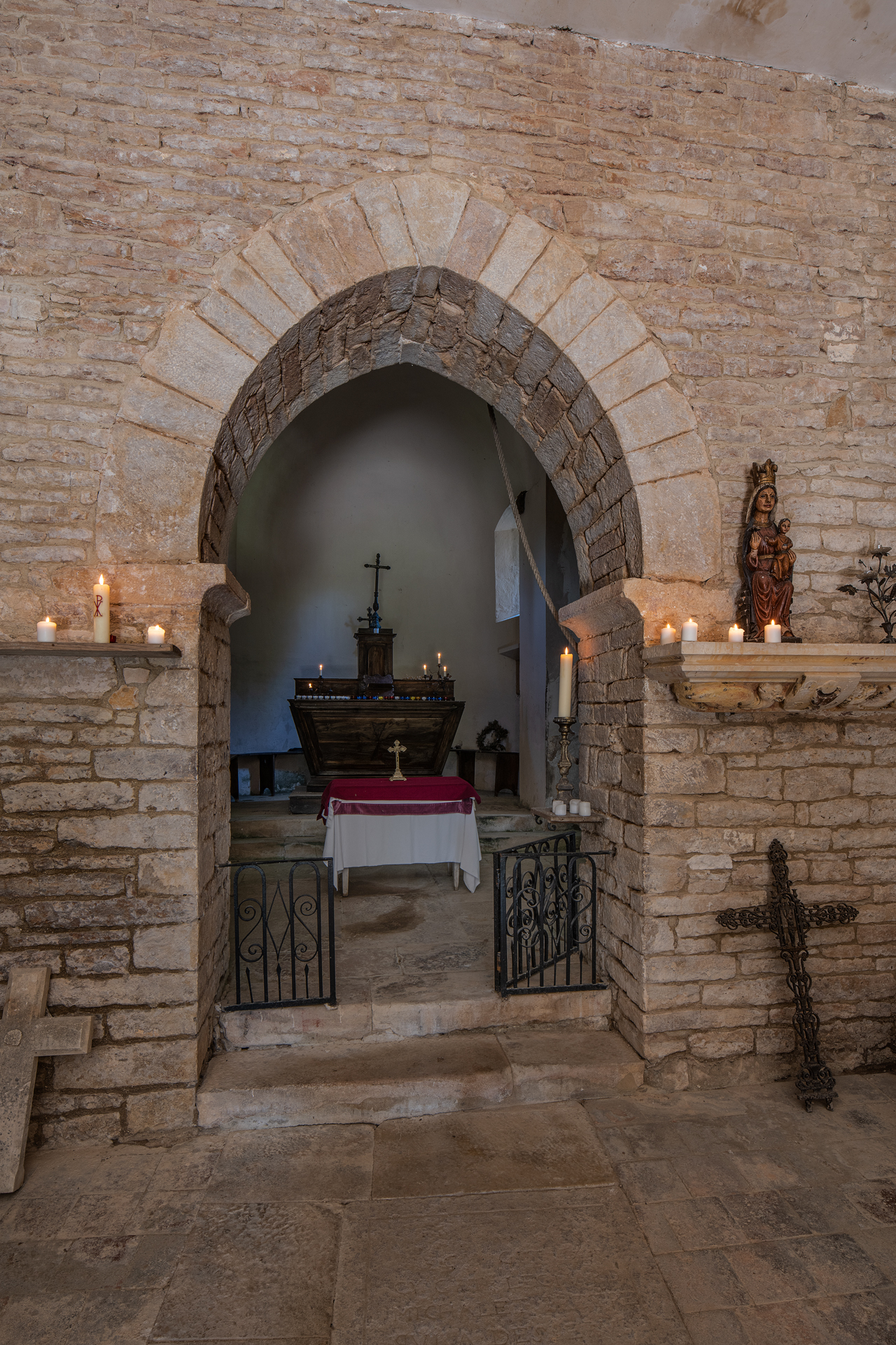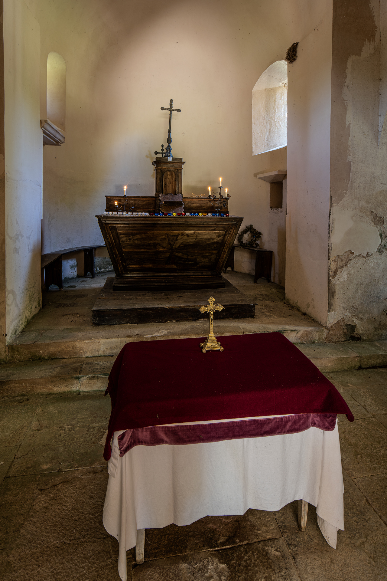 La nef est éclairée par une fenêtre à droite semblable à celle, également à droite, dans le chœur qui bénéficie de petites ouvertures en plein cintre ébrasées.