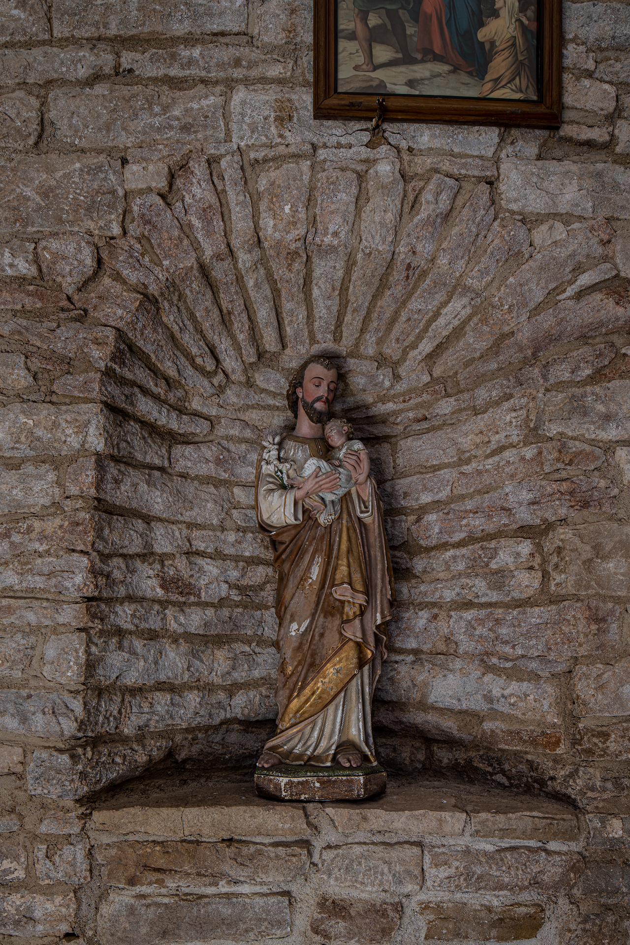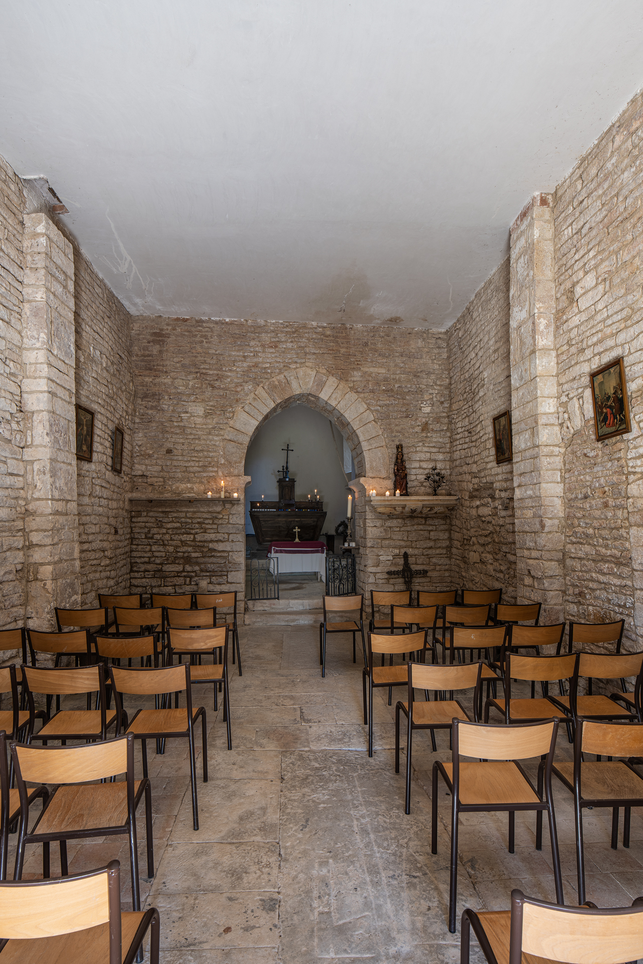 L’intérieur est maçonné en pierres apparentes comportant très peu de décor et d’éléments de mobilier.