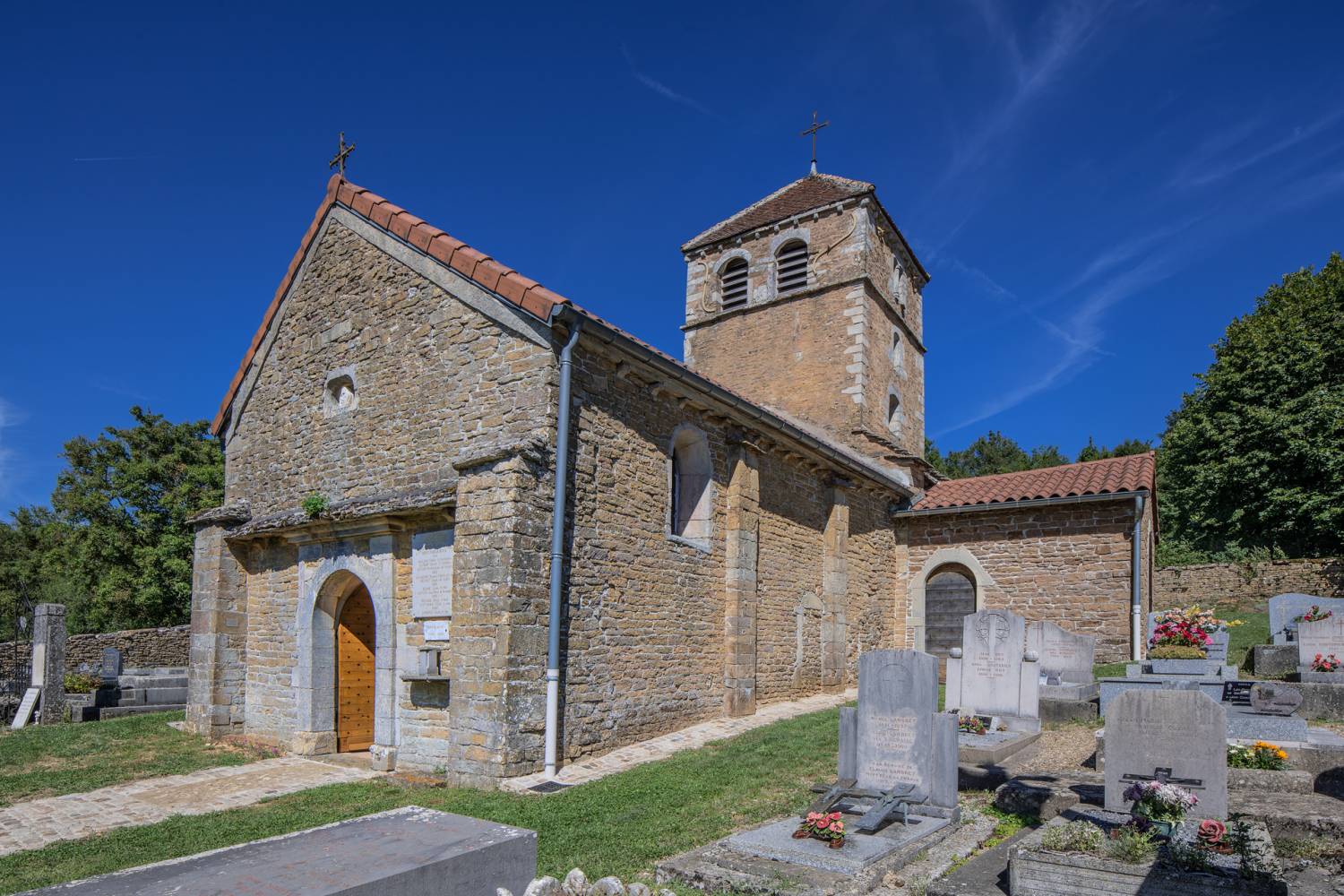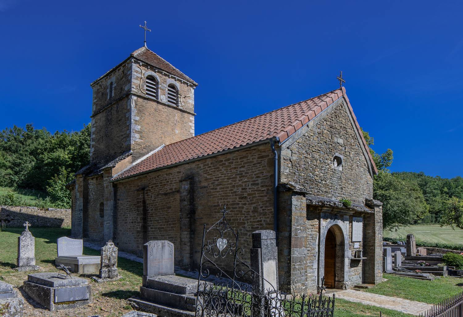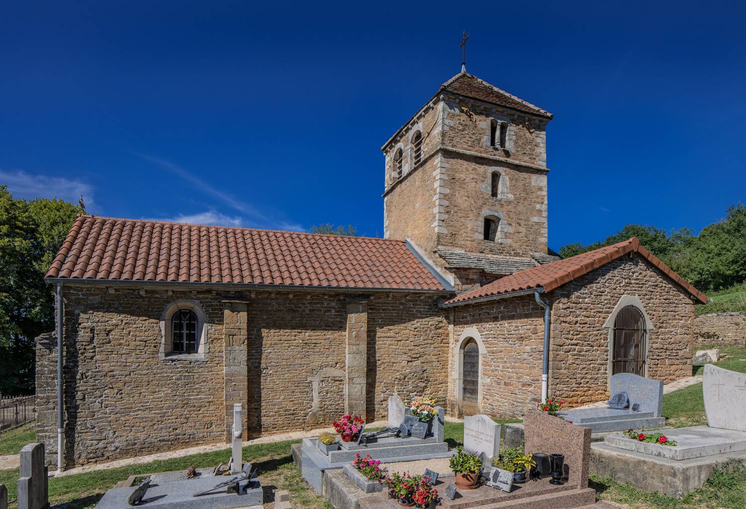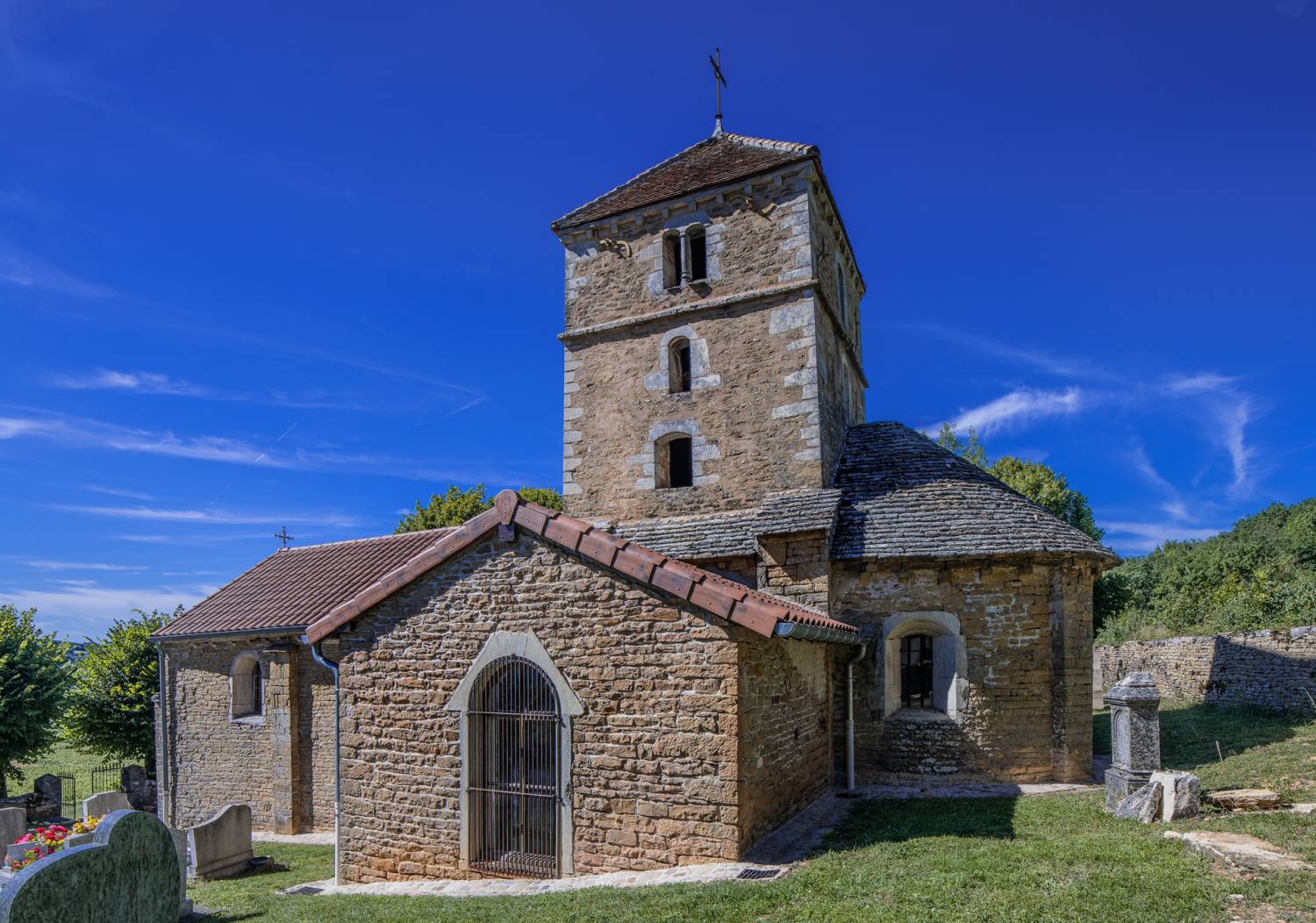 Au loin, se profilent l’église romane et le château-fort du site médiéval de Brancion. Le site (église, cimetière, mur de pierres sèches) a été classé au titre des Monuments historiques en 1942.