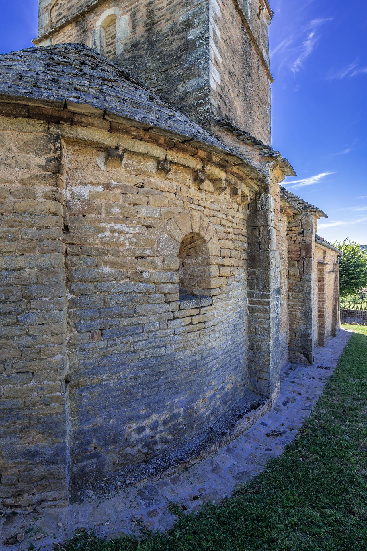 Sur la face sud du clocher carré dominé par une croix, les baies géminées qui ajourent le beffroi reposent sur des colonnettes médianes dont les bases disposent d’une mouluration gothique. Les toitures de la nef et de la sacristie ont été refaites récemment en tuiles mécaniques modernes alors que l’abside a conservé sa couverture en lauzes, comme à l’origine.