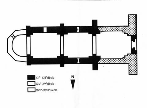 Une nouvelle travée fut alors ajoutée à la nef à l’ouest, sur laquelle fut remonté le portail roman d’origine. La nef, légèrement surélevée, reçut alors une nouvelle voûte en berceau brisé. Le chevet pentagonal date d’un remaniement plus tardif, du XVIIe ou XVIIIe siècle.