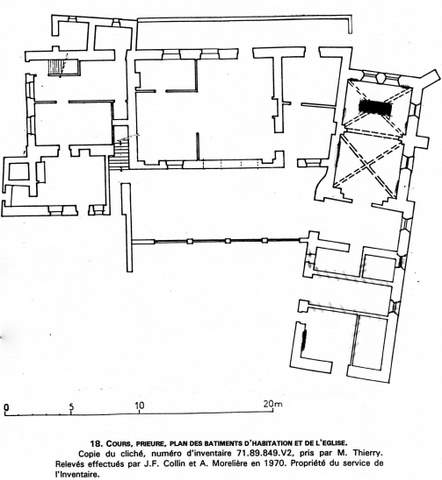 Le prieuré de Cours placé sous le double vocable de Saint Sulpice et saint Antoine dépendait du diocèse de Langres. Il n’est signalé dans les archives qu’à partir de 1116. A cette date, il est désigné comme une église à la collation de l’abbé de Saint-Michel de Tonnerre. En 1149, l’abbaye Saint-Pierred’Auxerre devint propriétaire de l’ « ecclesia » de Cours. Elle en restera propriétaire jusqu’à la Révolution. Il faut noter que l’église de Cours fut desservie au XVIIIème s. par des religieux prémontrés. Le prieuré fut vendu comme « bien national », le 9 février 1791. Ayant changé plusieurs fois de mains depuis cette date, il est occupé de nos jours par une petite communauté de Bénédictines. L’ensemble du prieuré surplombe la rivière du Serein. Il est formé de deux parties distinctes : d’une part, une grange dîmière et des écuries, et d’autre part, l’église. Ces bâtiments sont reliés entre eux par un corps de bâtiment regrettable du début du XXème siècle. La porte de la façade ouest, dont la facture est très proche de celle de l’hôtel de ville de Noyers-sur-Serein, a été percée en 1771 par le père Lezier, religieux prémontré desservant . On trouve dans les combles les traces d’un clocher élevé sur la première travée du chœur. Lorsque l’ancienne nef de l’église a été transformée en réfectoire, d’intéressantes découvertes ont été faites, en particulier des peintures murales du début du XVIème siècle. Sous le plâtre posé au XIXème s., des motifs végétaux peints sur les arcs sont apparus. L’ancien chœur de l’église, aujourd’hui utilisé comme chapelle privée, a conservé de nombreuses traces de décors peints. De plan barlong, ce chœur, de deux travées, séparées par un gros arc doubleau, de profil carré, est fermé à l’est par un chevet plat percé de deux fenêtres jumelées, cintrées et fortement ébrasées, et d’un oculus. Les arcs doubleaux reposent sur des piliers engagés. Les fûts des piliers sont couronnés de beaux chapiteaux à feuilles d’eau et à crochets. Cet ensemble peur être daté de la fin du XIIème siècle.