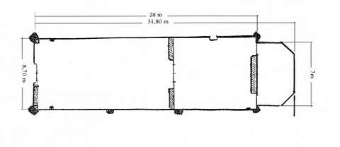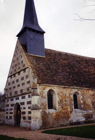 L’église, d’architecture très soignée, qui a été presque entièrement reconstruite au XVIe s. se caractérise au contraire par l’emploi de la pierre de taille, le silex noir étant réservé aux motifs décoratifs en damier qui ornent les deux murs pignons et le chœur : ils pourraient correspondre à une même campagne de travaux, la construction du mur nord de la nef et la reprise du mur sud en constituant une autre. La petite flèche d’ardoise qui surmonte la première travée de la nef en a remplacé une plus ancienne en 1837. Les proportions importantes de l’église s’expliquent probablement par le patronage des seigneurs de Grosley, qui furent successivement les comtes d’Harcourt au XVe s. et les ducs de Lorraine à partir de 1471. Construite sur un plan rectangulaire, l’église présente à l’ouest une façade constituée d’un vaste mur pignon avec rampants à crossettes, scandé par deux larmiers et contrebuté aux angles par des contreforts à doubles glacis au dessin très recherché. Le portail, refait en 1859, s’ouvre sous une arcade en plein cintre moulurée. A l’opposé, la sacristie s’appuie sur le chevet plat et forme une sorte d’abside pentagonale. Son toit, moins élevé que celui du chœur, laisse apparaître le pignon du mur est, semblable à celui de la façade ouest, mais ayant, lui, conservé sa croix faîtière d’origine .