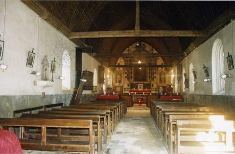 A l’intérieur, une même voûte en carène renversée couvre toute la longueur de l’édifice. La séparation entre les trois travées de la nef et les deux du chœur est seulement marquée par la présence de deux autels latéraux, dédiés l’un à saint Léger et l’autre à la Vierge, et par l’adjonction d’un Calvaire portant la dace de 1656 sur l’entrait servant de poutre de gloire .