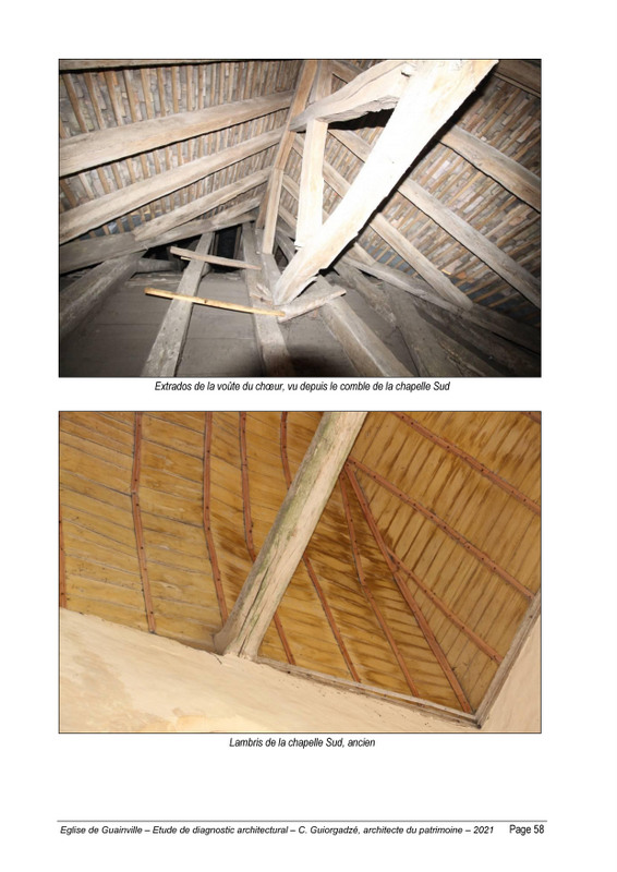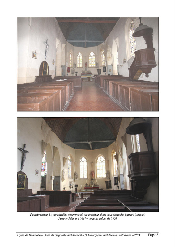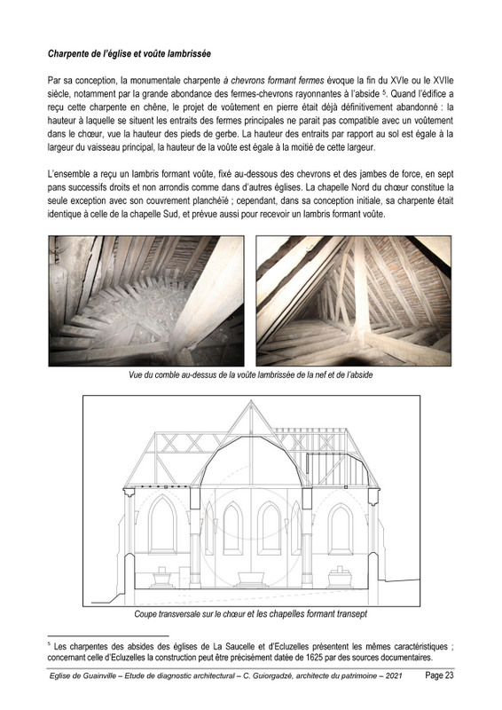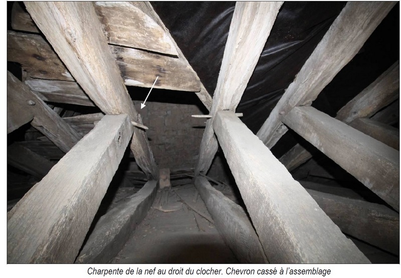 Par sa conception, la monumentale charpente à chevrons formant ferme évoque la fin du 16e ou le 17e siècle notamment par la grande abondance des fermes-chevrons rayonnantes de l’abside ( le projet de voûtement de la nef devait vraiment être définitivement abandonné. La hauteur des n’est pas compatible avec un voûtement )