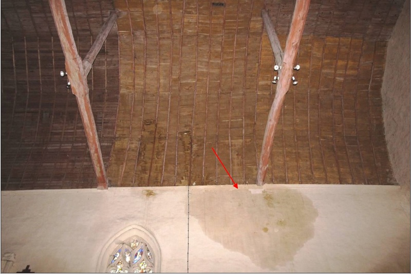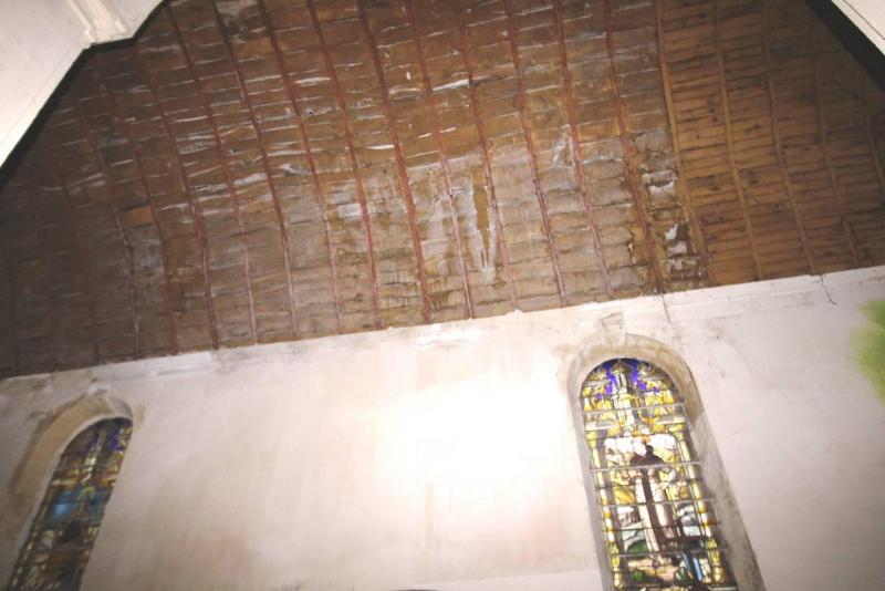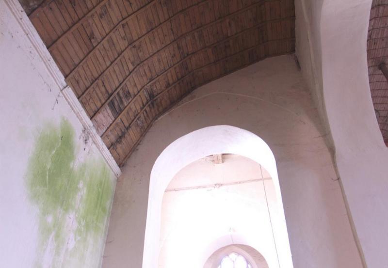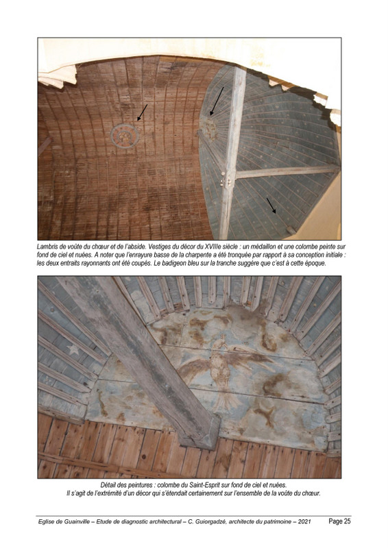 Vestige du décor peint sur la voûte du chœur : médaillon et colombes part sur fond de ciel et nuées. A noter que leurs rayures basses de la charpente a été tronquée par rapport à sa conception initiale puisque les 2 entrées rayonnantes ont été coupés.