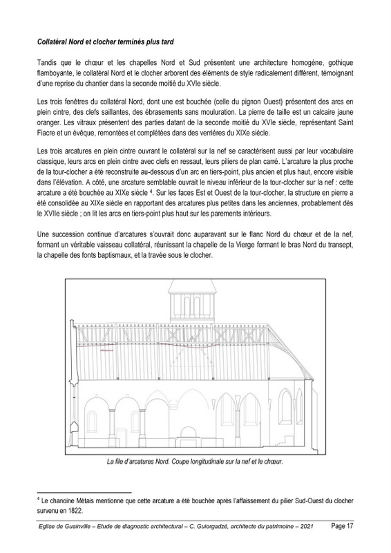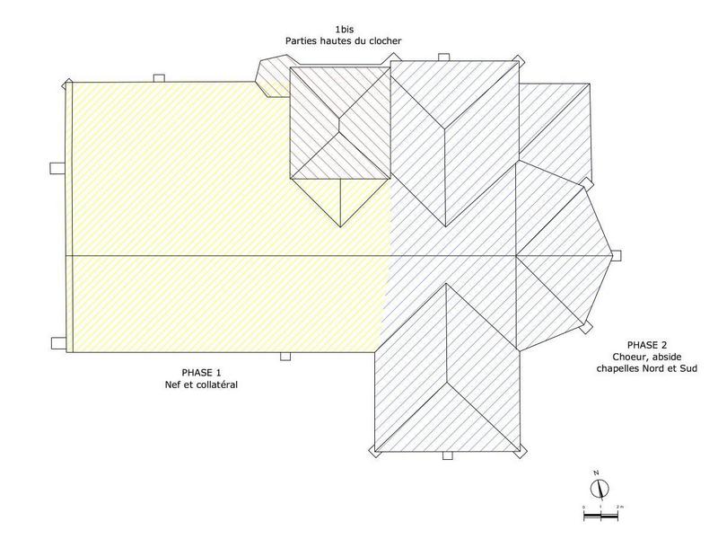 Le projet ambitieux initié autour de 1500 est cependant resté inachevé, le voûtement en pierre envisagé n’a pas été construit. Un collatéral a pu être projeté sur le collatéral sud de la nef. Le collatéral nord semble être resté aussi inachevé dans un premier temps au début du 16e siècle ce qui expliquerait que sa porte extérieure soit d’esprit gothique tardif tandis qu’en partie haute les 3 fenêtres, la corniche, le contrefort se rattachent au style de la 2nde renaissance. Le chantier aurait donc connu un temps d’arrêt entre 1510 et 1560 au moins.