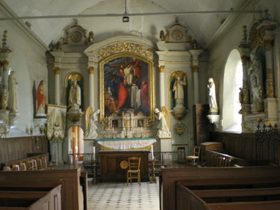 À l’intérieur, l’édifice, qui a perdu ses entraits d’origine, est simplement couvert d’une voûte en berceau de plâtre et conserve un riche mobilier dont un maître-autel du XVIIIe s. orné en son centre d’une Déposition de croix.
