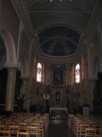 Élevée en pierre crayeuse sur des soubassements de grès, comme il est d’usage dans la région, l’église comprend une nef de quatre travées, séparée des collatéraux par deux files de trois colonnes, et prolongée par un chœur et une abside en demi-cercle. Couverte d’une voûte simulée, faite de plâtre sur armature de charpente, la nef n’a pas d’éclairage direct, car le profil de son comble à pente modérée rejoint pratiquement celui des toits des collatéraux, établis à un niveau légèrement inférieur.