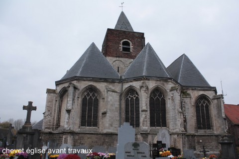 L’étage inférieur de la tour centrale, avec ses baies en plein cintre, doit remonter à la fin du XIIe s., et l’étage supérieur en briques au XVIIe. Le chœur dut être reconstruit à la fin du XVe s., si l’on en juge par le millésime de 1486 gravé dans la pierre, et les chapelles orientales ajoutées au XVIe siècle : Philippe de Stavèle, baron d’Haverskerque, fit don d’une cloche en 1557, et la date de 1588 figure au-dessus d’une des verrières.