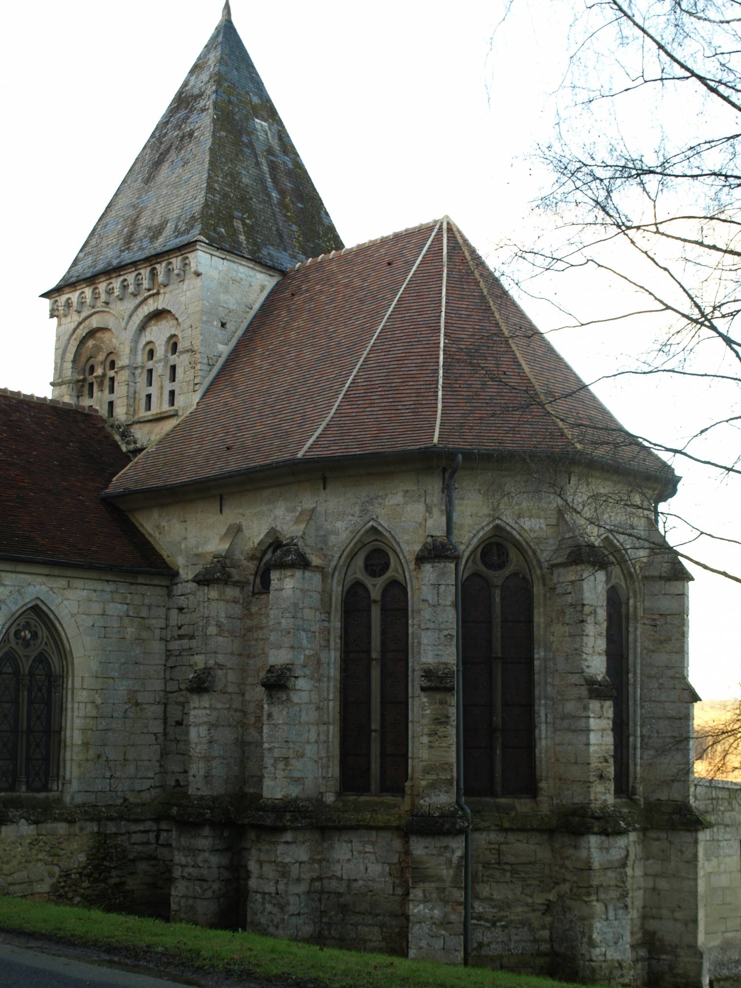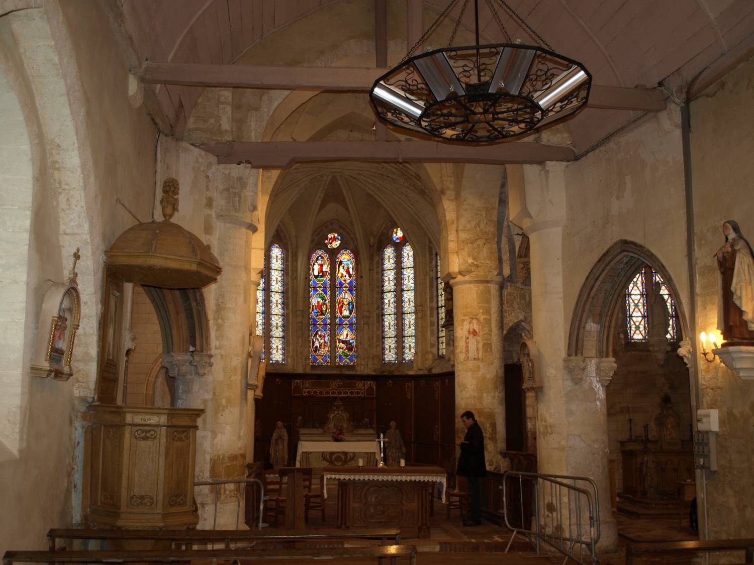 Reconstruite sans doute au début du XIIIe s., la nef à vaisseau unique est couverte d’une simple charpente lambrissée. Précédé par un petit porche, son portail occidental est couvert d’un grand tympan à décor de trilobes et comporte un exceptionnel vantail à panneaux trilobés, appartenant à la construction primitive. Dans le mur sud de la nef se voit encore une ancienne porte dotée d’un tympan trilobé, tandis que le mur nord est constitué de grandes arcades murées, témoins de l’existence passée d’un collatéral de ce côté. Plus élevé que la nef, le chevet a sans doute été reconstruit plus tardivement au cours du XIIIe s., sous la forme d’une travée droite et d’une abside polygonale flanquée de contreforts et percée de hautes fenêtres, dont les remplages ont été recréés au XIXe siècle. A l’intérieur, l’abside est couverte d’une voûte d’ogives reposant sur des colonnettes effilées, dans l’esprit de l’architecture gothique rayonnante. Cette voûte et les murs extérieurs du chevet ont été rehaussés d’environ un mètre, au moment de la transformation de la tour en clocher.