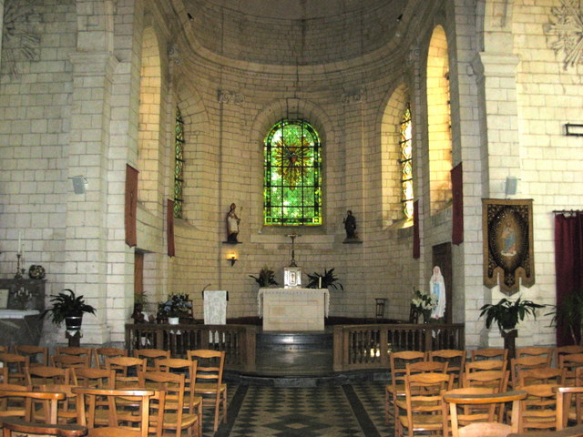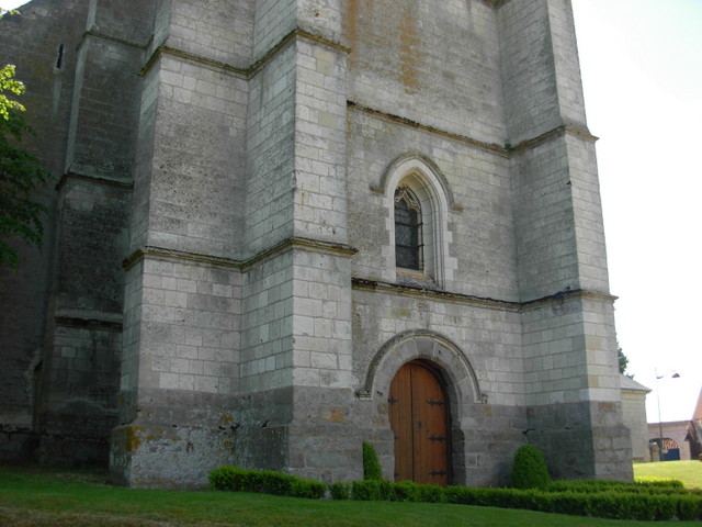 Datée du début du XVIIe s. par une inscription en façade et plusieurs graffiti, cette tour précède une nef de quatre travées à collatéraux, terminée par un chœur à abside semi-circulaire, élevée en 1782, quelques années après le château voisin. Également construites dans la pierre crayeuse locale, les colonnes de la nef supportent une suite de grandes arcades en plein cintre et une voûte en plâtre établie sur ossature de bois.