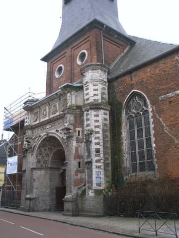 Représenté sur une gouache des « Albums » de Charles de Croÿ, exécutée dans les premières années du XVIIe s., l’édifice présente des maçonneries de briques rehaussées de chaînes de pierre crayeuse aux angles et autour des fenêtres. À l’ouest, les pignons correspondent à trois vaisseaux parallèles, celui du centre très développé, celui du sud limité à trois travées. Le portail Renaissance, encadré de colonnes détachées, s’ouvre devant une tour-clocher dont le comble d’ardoise se termine par une haute flèche ouvragée à l’allure encore gothique.