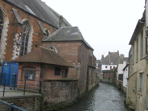 Église Notre-Dame. Entièrement rasée en 1553 sur ordre de Charles Quint, la ville d’Hesdin se situait dans la vallée de la Canche, à l’emplacement de l’actuel village de Vieil-Hesdin, au pied d’une puissante forteresse que les ducs de Bourgogne avaient humanisée et accompagnée d’extraordinaires jardins. Une ville nouvelle ne tarda pas à s’édifier en aval, et c’est le 15 juin 1565 qu’Antoine de Helfaut, gouverneur de la place, posa la première pierre de l’église, au bord de la rivière, dans un terrain particulièrement meuble, nécessitant d’importantes fondations. Une longue inscription, gravée sur un tableau de marbre, précise la chronologie des premiers travaux : construction du chœur en 1565, bénédiction en 1567, ouverture au culte en 1568, dédicace en 1573 et consécration solennelle en 1585 par l’évêque de Saint-Omer.