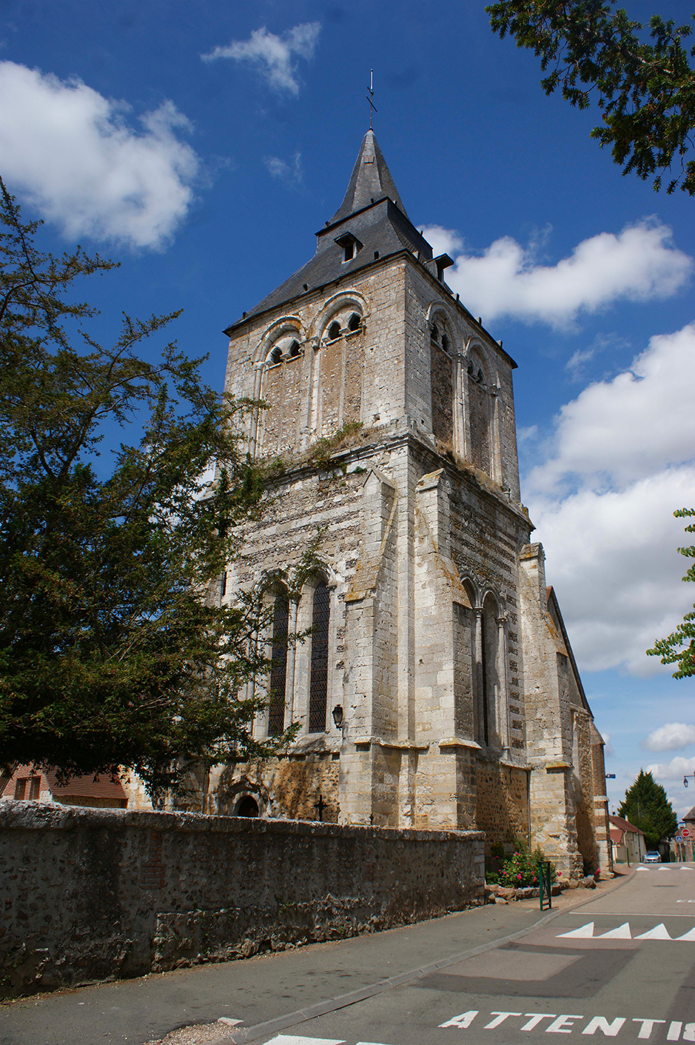 Une tour-clocher massive, de deux niveaux, contrebutée par de puissants contreforts en pierre de type gros lien et remplissages en silex taillés grossièrement, est surmontée d’une flèche en ardoises. La nef est couverte d’une charpente lambrissée, le choeur d’une voûte en plâtre. La couverture est en ardoises.