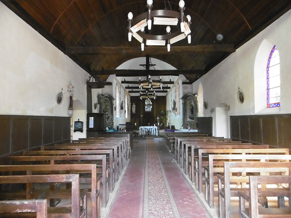 L’église est composée d’une nef simple et d’un choeur à chevet plat au volume légèrement plus étroit et surélevé par rapport à celui de la nef. Deux chapelles forment un faux transept au nord et au sud de la nef.