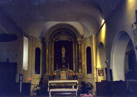 À l’intérieur, l’édifice était couvert jusqu’au XVIIIe s. d’un plafond de bois qui a été remplacé par des voûtes en plâtre au siècle suivant ; la voûte du collatéral, qui a souffert d’infiltrations, est très dégradée. Deux grandes arcades font communiquer la nef avec le bas-côté. Le mobilier date du XIXe s., les murs ont alors été pourvus de lambris d’appui, le sol est en partie encore garni des belles lauzes anciennes.