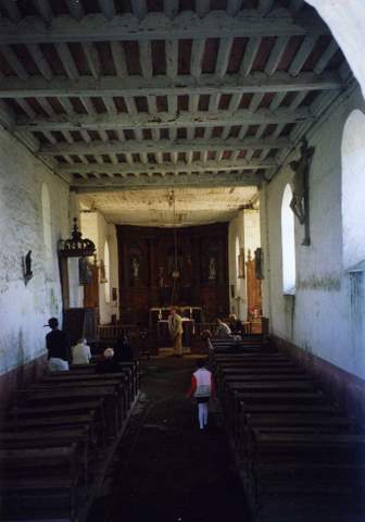 L’intérieur, très simple, est couvert d’un plafond en bois sur des poutres apparentes ; le carrelage ancien en terre cuite a été conservé. Le mobilier est assez exceptionnel. L’abside possède encore l’ensemble formé par le maître autel, son retable et son tabernacle avec deux anges, inscrit à l’Inventaire supplémentaire des Monuments historiques, ainsi que les fonts baptismaux en pierre du XVIe s., les statues de saint Jean l’Évangéliste et de saint Sébastien et un Christ en bois peint du XVIIe siècle. D’autre part, une Vierge à l’Enfant en pierre et un saint Gilles en bois polychrome du XVe s., saint Antoine et un saint évêque en pierre polychrome du XVIe s., saint Roch en pierre polychrome et saint Jean-Baptiste en bois du XVIIe s. sont classés depuis le 29 janvier 1982. Deux autels en bois du XVIIIe s. et un confessionnal de 1730 sont inscrits à l’inventaire départemental. Pour la réfection de la couverture du dôme, la Sauvegarde de l’Art Français a octroyé une subvention de 35 000 F en 1996.
