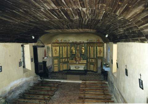 Le décor constitue l’intérêt principal de l’église. On notera, à l’extérieur, les traces d’une litre seigneuriale protégée en partie sous le porche. L’intérieur, dont le volume très simple est couvert d’une voûte lambrissée et surbaissée, est dominé par le grand Christ en croix du retable entre la Vierge et un saint Paulin évêque, le Christ en ronde-bosse, les deux saints en demi-relief de bois polychrome et doré. De part et d’autre de l’autel, les boiseries peintes sont scandées par des pilastres qui supportent une corniche avec des pots-à-feu et les profils en médaillons de la Vierge et du Christ. Des chutes de guirlandes soulignent la verticalité des pilastres, tandis que des médaillons centrés meublent les tableaux rectangulaires au-dessus des portes.