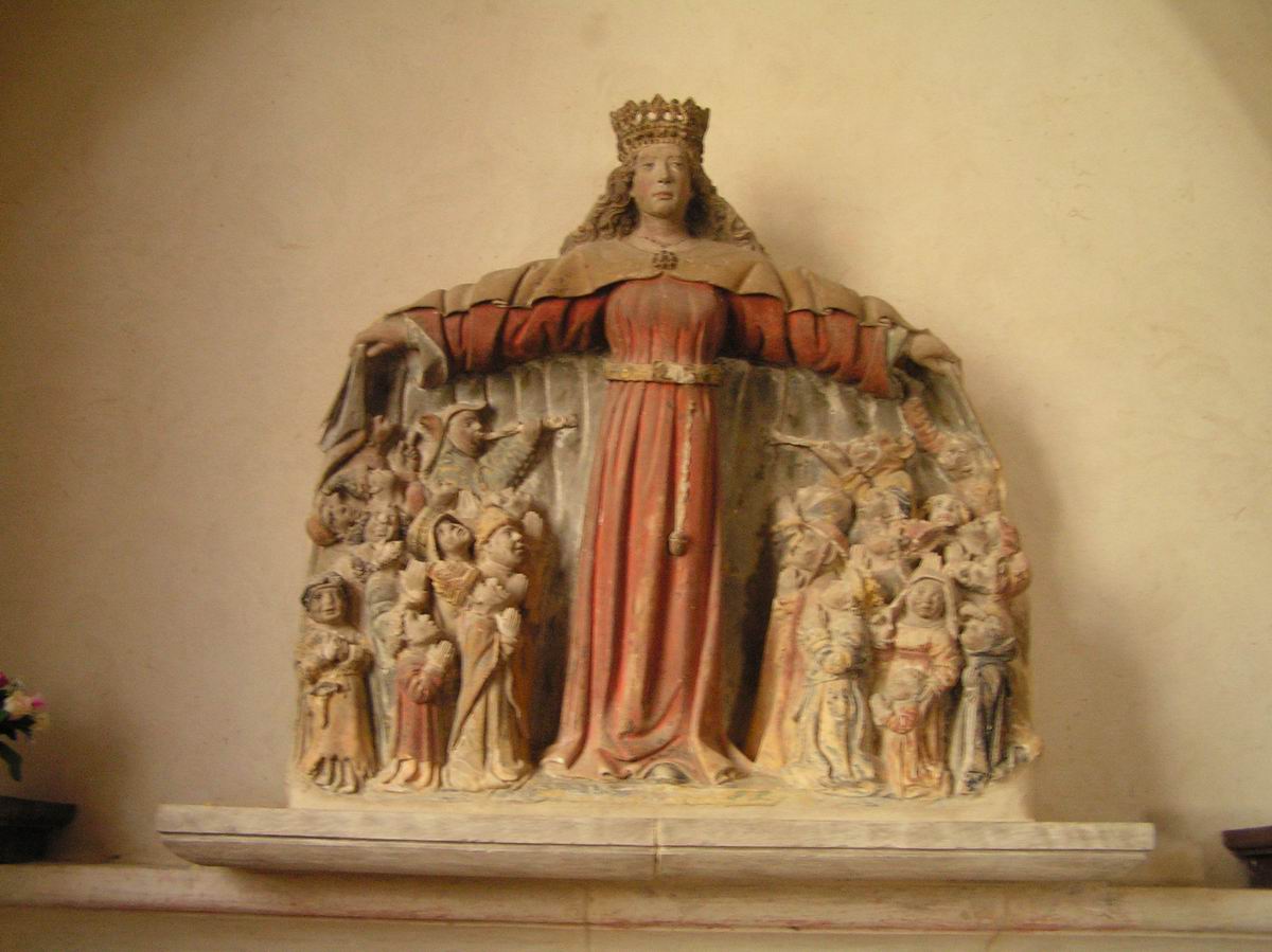 L’édifice abrite aussi des statues et des autels dédiés à divers saints. La sculpture la plus intéressante est celle de la Vierge au Manteau, sculpture du XVIe siècle, est taillée dans un seul bloc de pierre. La Vierge couronnée, bras étendus sous un manteau plissé, est entourée de 26 personnages répartis de chaque côté, mêlant clercs, laïcs et figures populaires dans un désordre expressif. Parmi eux, un petit personnage au visage narquois, habillé comme un artisan, pourrait être l’artiste lui-même. D’autres figures incluent un Pape, un musicien, des moines, un roi couronné, une matronne avec son enfant, et un moine curieux. L’artiste a créé des portraits vivants, souvent caricaturaux, mélangeant les statuts sociaux