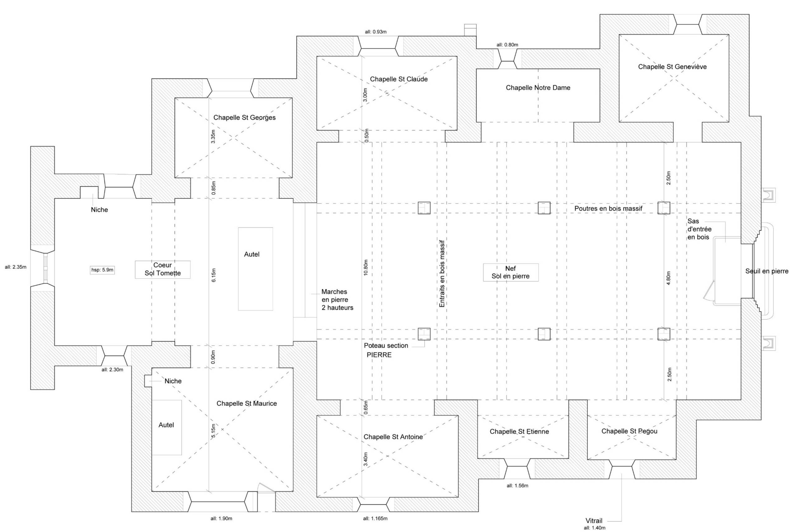 À l’intérieur, la nef est soutenue par des piliers en moellons datant du XVIe siècle. Après avoir été couverte d’un lambris au XVIIe siècle, la nef a retrouvé son aspect d’origine lors de la restauration de 1967. L’église possède plusieurs chapelles gothiques, dont celles de Saint-Georges, Saint-Maurice et Sainte-Geneviève.