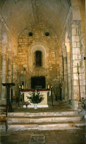 La partie la plus intéressante est le sanctuaire roman. Il peut remonter à la fin du XIe s., non sans de nombreuses réminiscences carolingiennes, comme son mur oriental plat, percé assez haut d’une fenêtre unique en plein cintre à deux ressauts faiblement ébrasés que cantonnent deux colonnettes. Au-dessus apparaissent à droite et à gauche deux petits oculi sous une longue voûte en berceau plein cintre qui couvre l’ensemble du chœur. Soutenant ce berceau de chaque côté, une colonnade à trois arcs se déploie sur quatre hautes colonnes isolées dont la structure n’est pas fréquente dans l’art roman : de longs tambours en délit sont rattachés à la paroi par une courte assise supérieure engagée sous un chapiteau cubique à décor sculpté ; une deuxième assise également courte est engagée au milieu de la colonne ainsi qu’une courte assise inférieure qui correspond aux bases en bobine. Les arcs plein cintre étroits et sans archivolte que soutiennent les colonnes portent une corniche dont le chanfrein continu est gravé d’un décor de palmettes d’aspect très préroman. Les chapiteaux cubiques à décor floral sec et bien détaché sont de la même veine que ceux qu’on trouve dans plusieurs églises du Quercy, du Rouergue ou de la Gascogne tels Nant, Duravel ou Peyrusse-Grande, entre autres. Leurs tailloirs en biseau sont ornés de frettes du côté nord, et de l’autre de tableaux rectangulaires incisés comme sur certains chapiteaux carolingiens. Cet ensemble est revêtu d’un décor peint d’époque gothique encore peu dégagé, vraisemblablement du XIVe siècle. Sa structure a pu inspirer des édifices moins monumentaux mais charmants comme l’arcature intérieure du prieuré de Merlande. À l’entrée, deux ressauts correspondant à la hauteur totale du chœur sont limités en haut par une assise horizontale carrée sous laquelle on lit, du côté nord, une étoile à six pétales inscrite dans un hexagone, et au midi une fleur radiante dont les rayons sont légèrement infléchis, donnant l’impression d’un mouvement tournant. Les deux chapiteaux sur colonnes qui encadrent le ressaut donnant entrée à l’absidiole sud sont anciens et de même facture que ceux du chœur. Leurs tailloirs en biseau portent des palmettes. Les chapiteaux de l’absidiole nord sont modernes.
