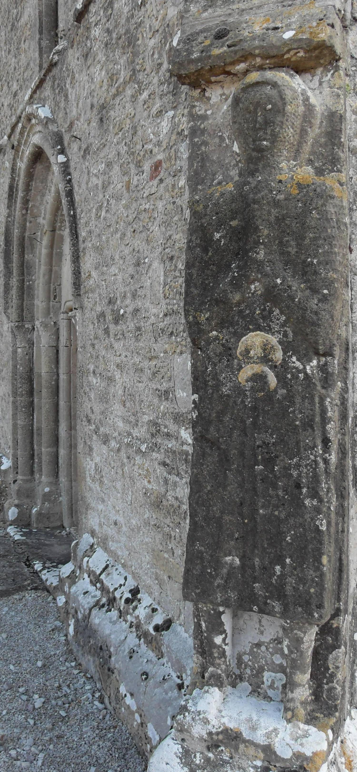 Les contreforts angulaires de la façade ouest présentent la particularité d’accueillir des gisants, insérés de façon verticale, au XIIe ou au XIIIe siècles. Leur présence pourrait s’expliquer par la disparition de l’histoire mémorielle de l’identité de ces ancêtres des patrons laïcs de la paroisse ou bien par l’investissement du chœur par un nouveau lignage pour s’y faire inhumer.