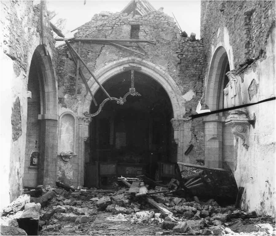 Joganville est l’une des premières villes libérées en 1944. Elle est très endommagée suite aux bombardements du Débarquement : les couvertures (toiture, charpentes, voûtes maçonnées et lambrissées) ont été incendiées et soufflées par un obus tombé dans la tour-clocher, le riche et remarquable mobilier liturgique a été grandement altéré ou détruit sous les chutes des couvertures, les vitraux sont soufflés, les enduis intérieurs altérés.