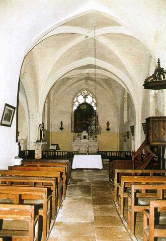 Le chœur est une reconstruction de la deuxième moitié du XVe siècle. Ses deux travées, terminées par un chevet plat, sont couvertes de voûtes d’ogives à liernes, dont certaines en bois sont tombées, et dont les nervures prismatiques pénètrent directement dans les supports engagés. Le chœur est largement éclairé par des fenêtres à lancettes et remplages de la même époque. Au nord, s’ouvre une chapelle seigneuriale, d’une construction analogue, voûtée d’ogives à liernes qui retombent sur des consoles sculptées d’écus aujourd’hui lisses. Dans le mur nord, une belle porte à linteau droit et entablement décoré de losanges, bien caractéristique de la première Renaissance, permettait au seigneur d’accéder directement à cet espace réservé.