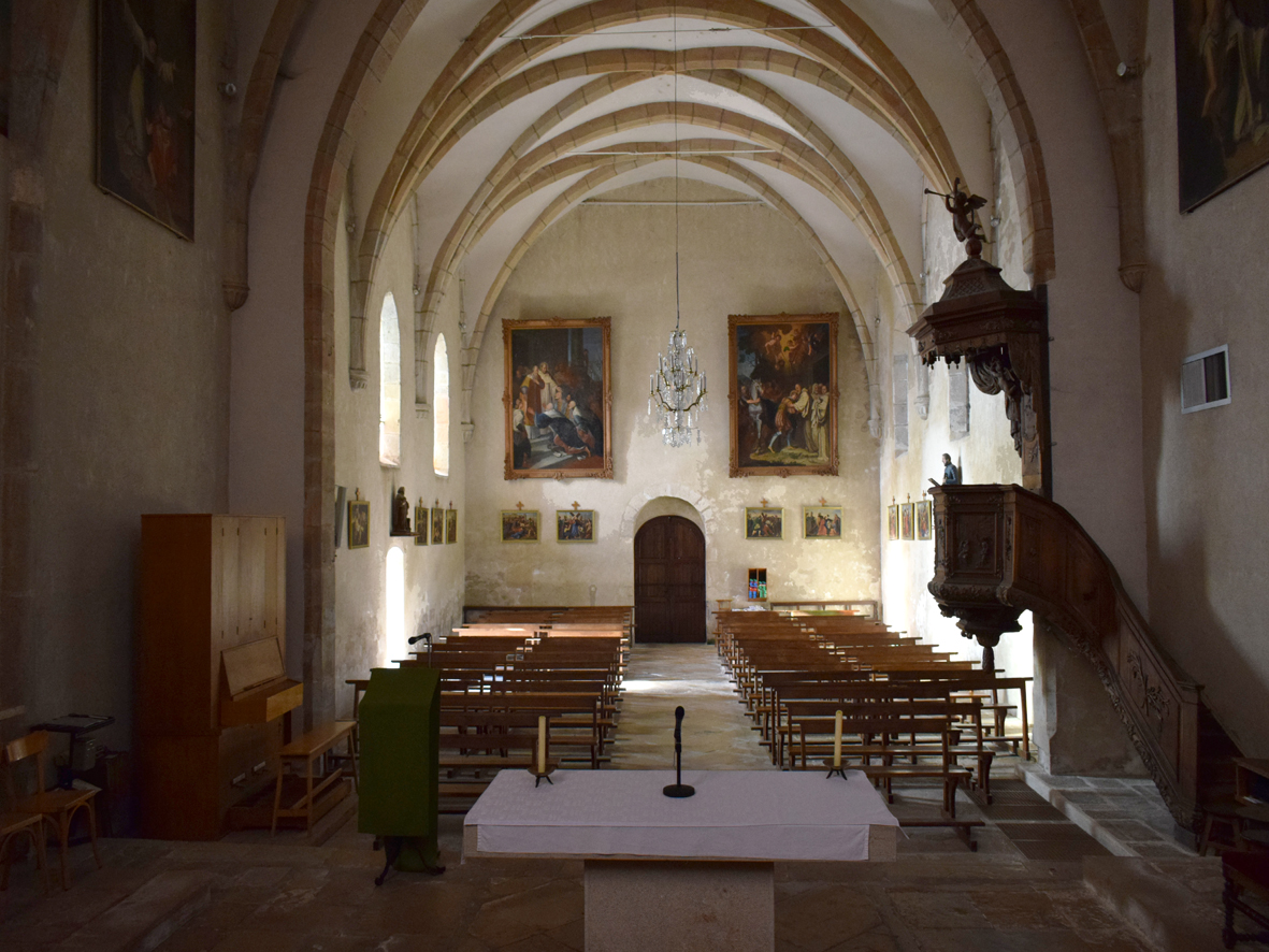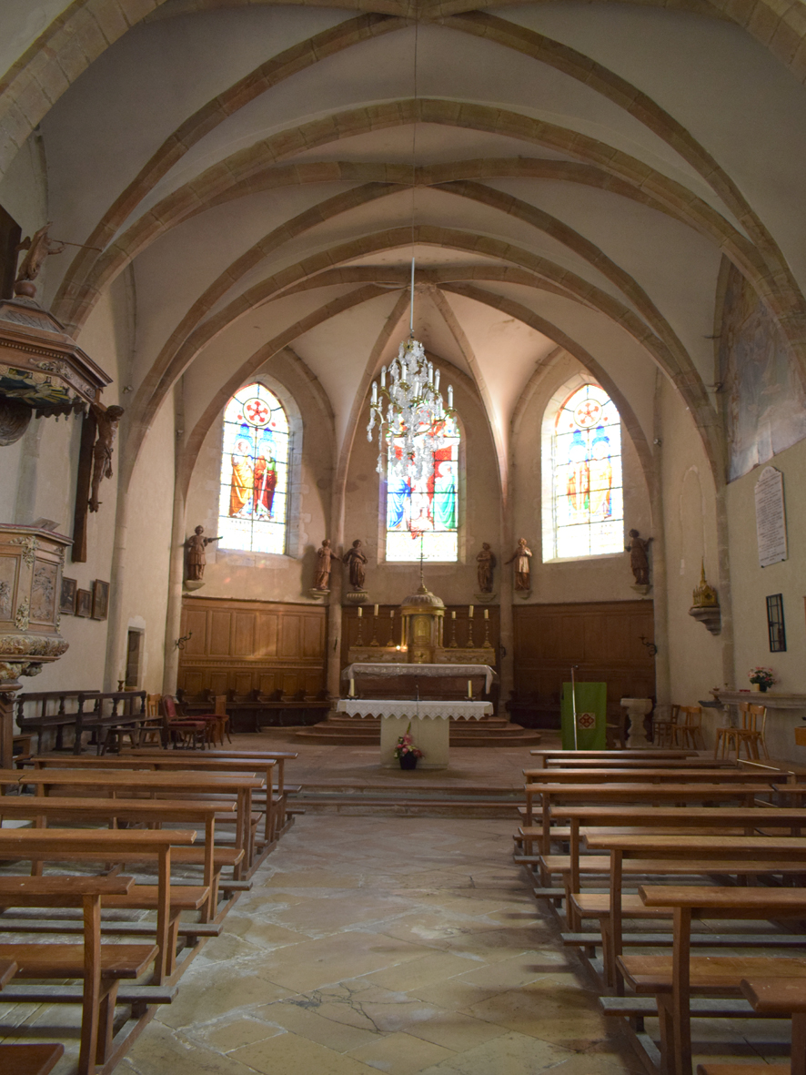 Il a été répété que la nef remonte à 1749 (qui devient 1729 chez Tournier), par le fait que cette date se lit sur le portail. En réalité, c’est ce dernier seulement qui est aussi tardif ; la nef_ très comparable à celle de Menotey, terminée par un clocher marqué 1604 _ manifeste l’ultime gothique prolongé jusqu’au début du xvne siècle; pour enlever toute hésitation, la niche pratiquée dans le mur sud affiche son année, 1606, jalon terminal pour la nef. Les armoiries visibles sur le linteau extérieur de la porte sud, de … aux trois fasces de … , n’ont pu être identifiées ; elles figurent aussi sur une ancienne clé de voûte conservée au prieuré, mais ne semblent pas répondre à un prieur connu. Faute de mieux, signalons qu’un fief de Verchamp, portant de sable aux trois fasces d’or, av·ait été au XIVe siècle uni par un prieur à la seigneurie de Jouhe.