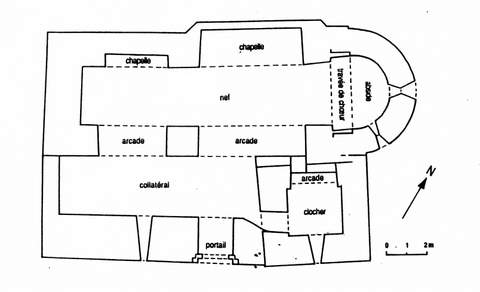 Á flanc de montagne, près d’un tout petit village, l’église de Jujols paraît dater du XIe s. à cause de quelques détails caractéristiques ; mais, à vrai dire, il s’agit d’un édifice profondément remanié dont l’archéologie reste à faire. Le plus assuré serait, à son abside, le décor extérieur caractéristique d’arcatures du premier art roman méridional. Cette abside jouxte une tour carrée, dont il ne reste que la base, à supposer qu’elle fût jamais achevée. Pour le reste, il s’agit de structures massives qui envahissent un peu tout, l’espace intérieur comme l’espace extérieur avec d’énormes contreforts (certains évidemment modernes). Cet aspect empirique et surdimensionné apparaît à la lecture du plan, où les piédroits de l’arc triomphal empiètent sur l’ouverture de l’abside, et de la coupe, où les formes trapues et lourdes de l’édifice s’imposent. On peut imaginer un édifice primitif tout simple, nef unique et abside en cul-de-four, peut-être cantonné d’un clocher-tour. La tour actuelle, constituée seulement d’une base haute de cinq mètres environ, a plus d’élévation sur sa face ouest, devenue un clocher-mur : cette face présente le départ de deux larges lésènes. L’ensemble serait un modèle courant dans cette région au XIe siècle. La nef unique primitive n’était pas voûtée, elle aurait pu ensuite faire l’objet d’une extension au sud, un bas-côté parallèle à la nef, venant buter sur le clocher : là encore, il s’agirait dans cette hypothèse d’un modèle de développement architectural dont on a bien d’autres exemples pour des édifices paroissiaux de ce type. Les voûtes sont-elles venues avec la construction du bas-côté, ou sont-elles plus tardives ? On peut se poser la question, car le caractère massif des maçonneries, comme le découronnement de la tour laissent supposer une reconstruction après destruction : il y a comme une hypertrophie des moyens employés, malgré la modestie des espaces, un peu comme une précaution exagérée qui suivrait l’expérience d’un désastre. On a bien évidemment en mémoire le tremblement de terre de 1428, et son cortège de destructions dans cette région. Sur la coupe, on observe combien le bas-côté couvert d’un berceau en quart-de-cercle, reposant sur un mur sud de deux mètres d’épaisseur semble conçu comme un gigantesque contrefort pour la nef. Quoiqu’il en soit, on ne décèle pas, à première vue, dans les maçonneries d’indices qui pourraient appuyer ce raisonnement de façon décisive. Une véritable étude reste à entreprendre. La porte de l’édifice est en plein cintre, appareillée, sans ornement particulier, à deux rouleaux. Il peut s’agir d’une porte médiévale, remployée si la construction du mur est plus tardive (on remarque en particulier qu’à la pierre de taille se substitue la maçonnerie de schiste à deux endroits du rouleau extérieur), mais elle n’évoque pas le XIe siècle. Les vantaux de la porte présentent des pentures de fer forgé médiévales, simples (bien moins élaborées que les célèbres ferrures romanes d’autres églises de la région), mais remployées de façon décorative, sans respecter le schéma primitif.
