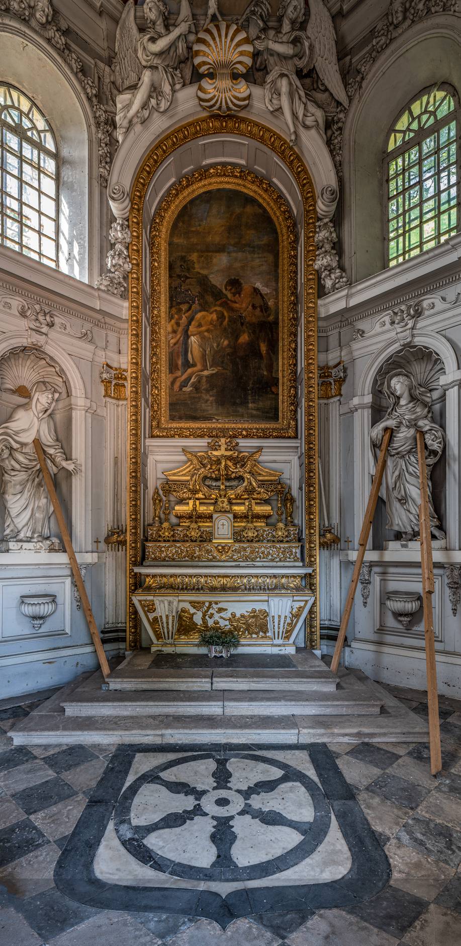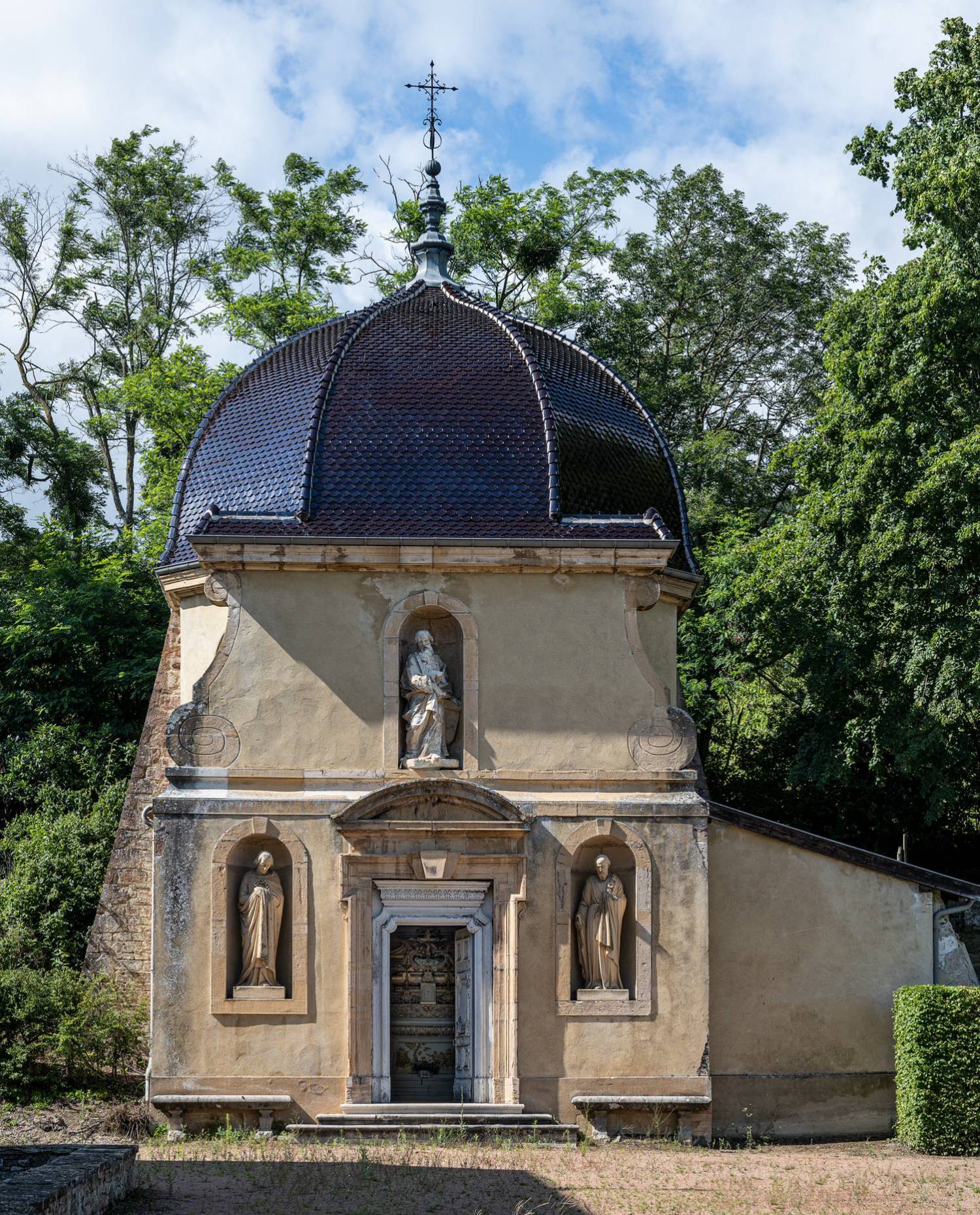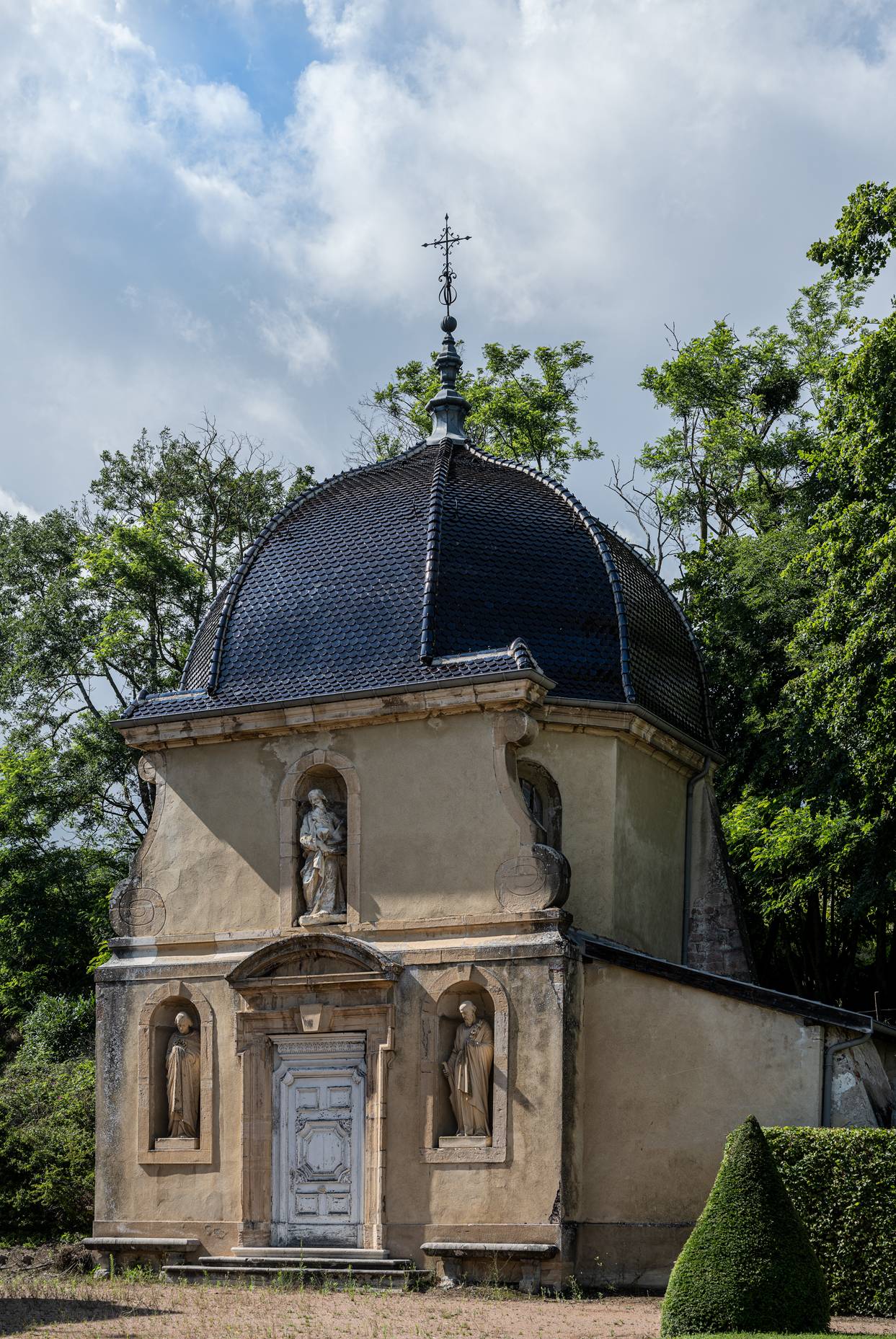 De l’autre côté du château, les jardins occupent le reste de la terrasse, pour se terminer en pointe avec la cascade, accentuant l’effet de perspective monumentale. C’est sur le côté nord de ce parc que l’on découvre la chapelle ; construite sur un plan octogonal, trois grandes statues ornent l’extérieur, fort élégant avec son dôme à huit pans. Malgré la taille très intimiste de l’édifice (un carré de 8 m et 15 m de haut), ses proportions dégagent un équilibre caractéristique de la fin du XVIIesiècle.