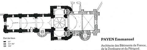 Située dans le voisinage immédiat du château de Pruchardie dont elle dépendait autrefois, l’église de Jumilhac était un important lieu de pèlerinage, située sur l’un des chemins de saine Jacques de Compostelle. Dédiée à saint Pierre-ès-Liens, c’est maintenant une église paroissiale. Le plan est en forme de croix latine orienté. La nef étroite de trois travées sans collatéraux est prolongée par un large transept avec absidioles garnissant le côté est de chaque bras ; un large chœur de deux travées a remplacé au XVème s. l’abside romane en hémicycle, il porte une voûte sur croisée d’ogives. La nef a perdu son voûtement d’origine, le transept a gardé la coupole sur trompes du carré et les voûtes en berceau des bras nord et sud. Certaines fenêtres en plein cintre et fortement ébrasées à l’intérieur datent sans doute de l’origine de la construction. Celles qui éclairent le chevet plat et les extrémités du transept sont à deux lancettes surmontées d’un remplage rayonnant. À l’extérieur, des contreforts à glacis soutienne nt les murs, et sur le côté sud, une grosse tour cylindrique flanque la seconde travée du chœur. La tour octogonale qui surmonte la coupole à la croisée du transept est formée de deux étages en pierre percés d’ouvertures en plein cintre géminées et à double archivolte séparées par une colonne cylindrique; les masques sculptés dans la pierre ornent la partie centrale de l’archivolte extérieure ; certaines de ces ouvertures ont été obstruées. La cour est surmenée d’une courte flèche en ardoise. Le mobilier intérieur est assez riche. Un maître-autel et son retable du XVIIème s. sont classés Monuments historiques. Les stalles datent du XVIIIème s. et on a récemment dégagé des peintures murales cachées par un re table du XIXème s. Pour aider à la restauration de la couverture du chœur faire de tuiles plates et à celle de l’escalier en lauzes, la Sauvegarde de l’Art Français a versé une subvention de 90 000 F en 199 2, puis 80 000 F en 1993 pour la restauration de la nef et de la croisée du transept.