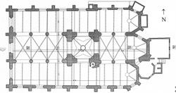 En l’absence de transept, les trois vaisseaux comptent trois travées de nef, une travée correspondant à la tour centrale, et deux travées de chœur terminées par un sanctuaire à trois ou cinq pans. L’église n’est pas voûtée, à l’exception de la travée formant la base de la tour centrale. Haute de 29 mètres, cette dernière est un puissant ouvrage de plan carré, surmonté d’une flèche polygonale en charpente. Son décor d’architecture, particulièrement soigné, consiste en une paire de grandes arcades au profil surbaissé, ornées de remplages simulés, une seconde paire de grandes fenêtres géminées, probablement reprises au XIXes., correspondant à l’étage des cloches, et une suite d’arcatures aveugles simulant une balustrade, au pied de la flèche. La présence de hautes arcatures analogues, sur les contreforts d’angle, contribue à l’élancement de la silhouette d’ensemble.