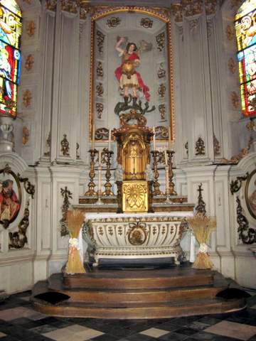 Comme c’est généralement le cas en Flandre maritime, l’église abrite un remarquable mobilier des XVIIeet XVIIIes., en particulier cinq retables. Le maître-autel, au centre, s’inscrit sous une figure de saint Michel, dans un décor de pilastres blancs rehaussés d’or. L’un des retables latéraux s’organise autour des figures de la Vierge du Rosaire et de saint Dominique, placées dans une perspective feinte, encadrée de pilastres et de panneaux peints de deux tons de marbres simulés, sous une gloire logée dans le cul-de-four. Probablement réalisé à l’imitation de celui de Saint-Vaast d’Hondschoote, il est accompagné des statues de saint Thomas d’Aquin et de saint Jacques de Menavia. L’autel et le tabernacle ont dû être renouvelés au XIXes., et la restauration effectuée en 1995 a restitué à l’ensemble sa polychromie d’origine.