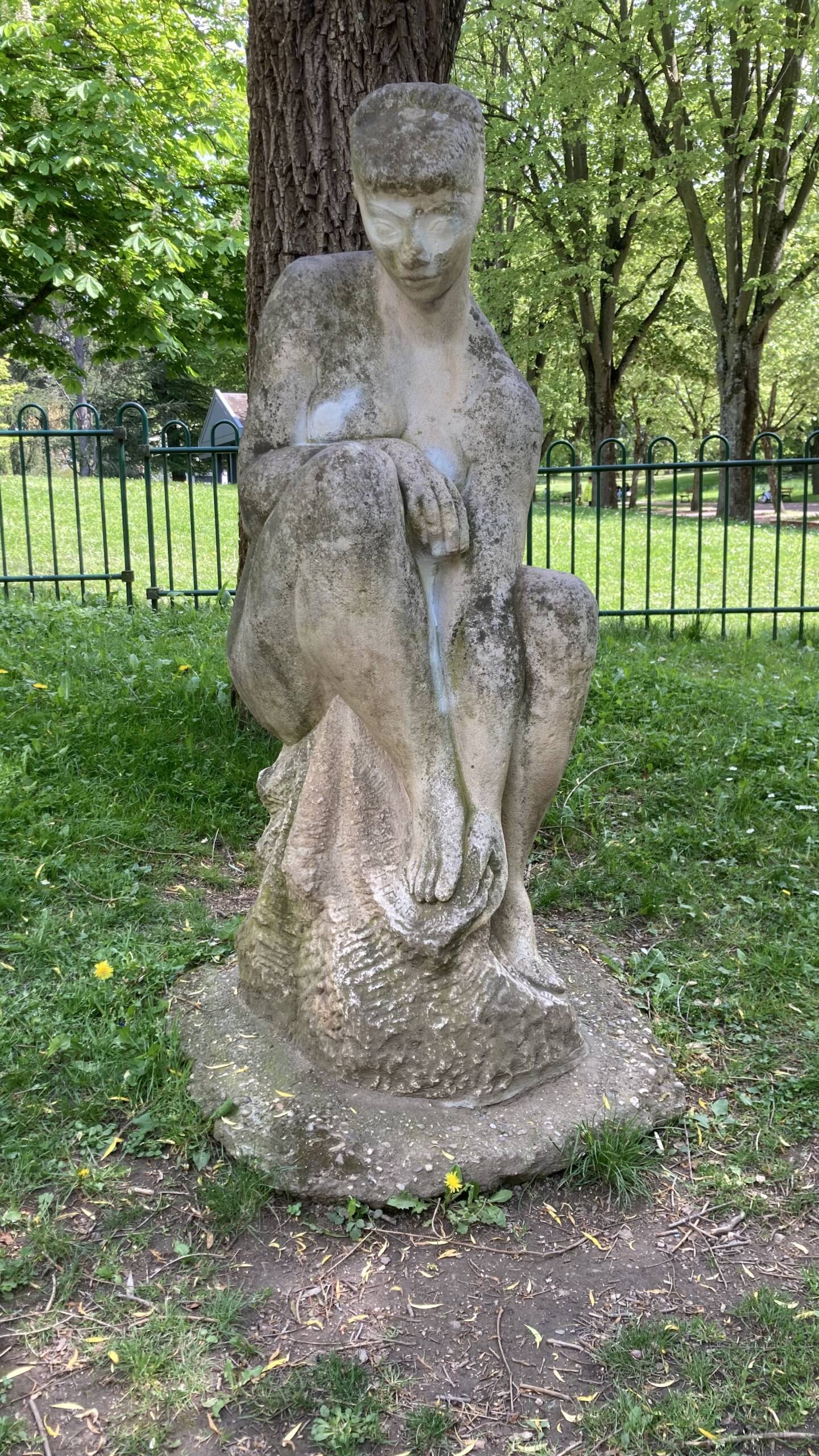 Taillée dans un imposant bloc de pierre calcaire de 1,5 tonne, cette œuvre de plein air incarne à la fois la douceur et la force, dans un style figuratif élégant. Déplacée une première fois à la fin des années 1960, elle se trouve aujourd’hui à proximité de la pataugeoire du parc, où un réaménagement paysager en cours implique un nouveau déplacement de quelques mètres vers le chemin d’eau.