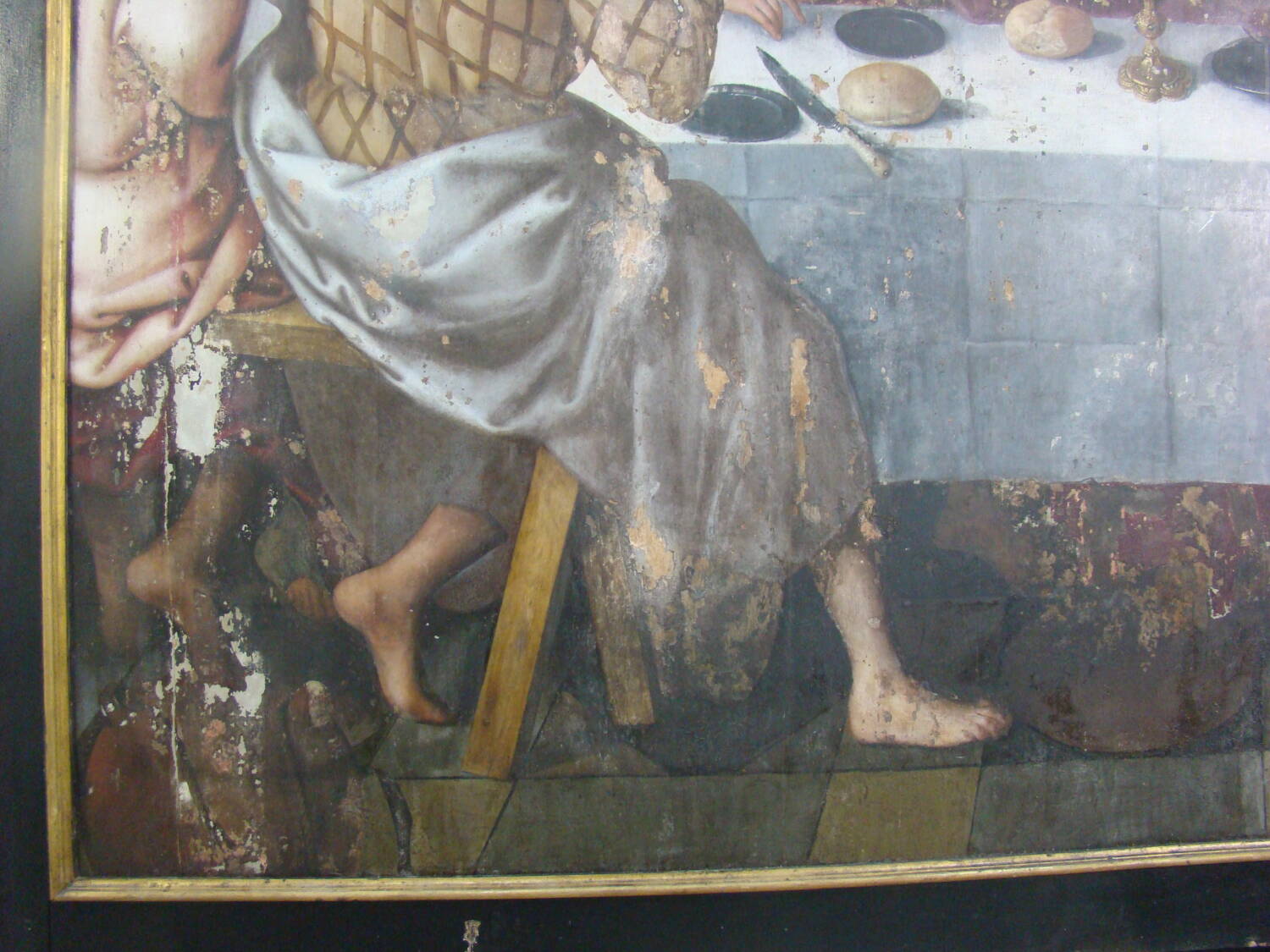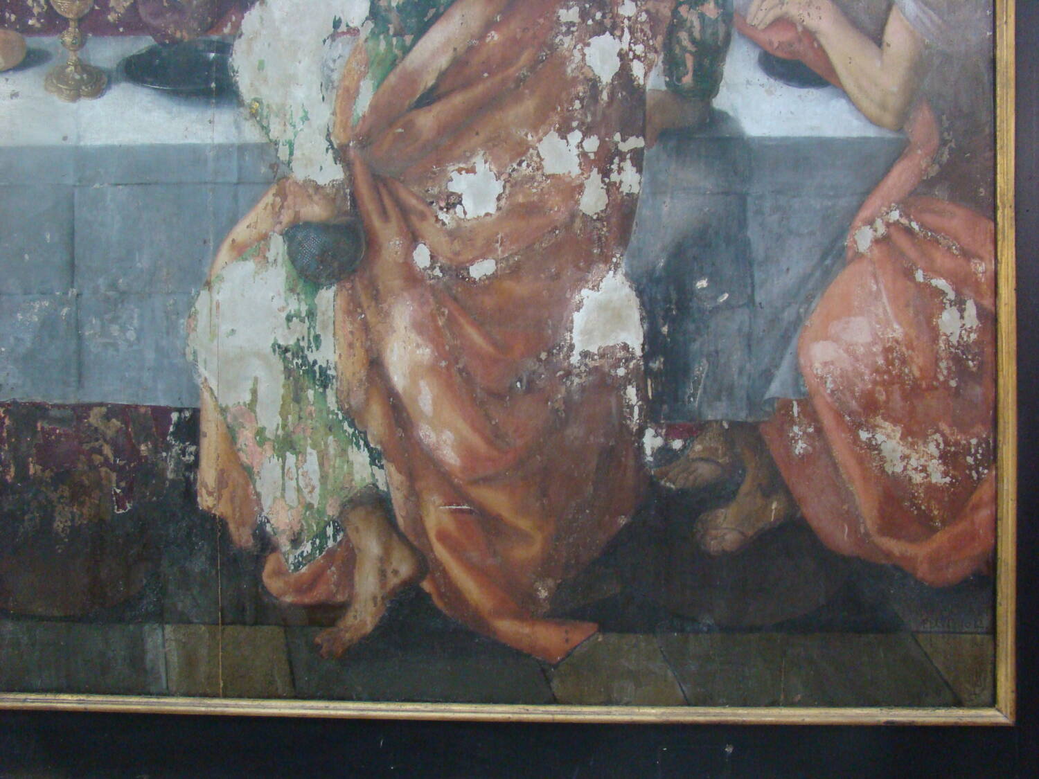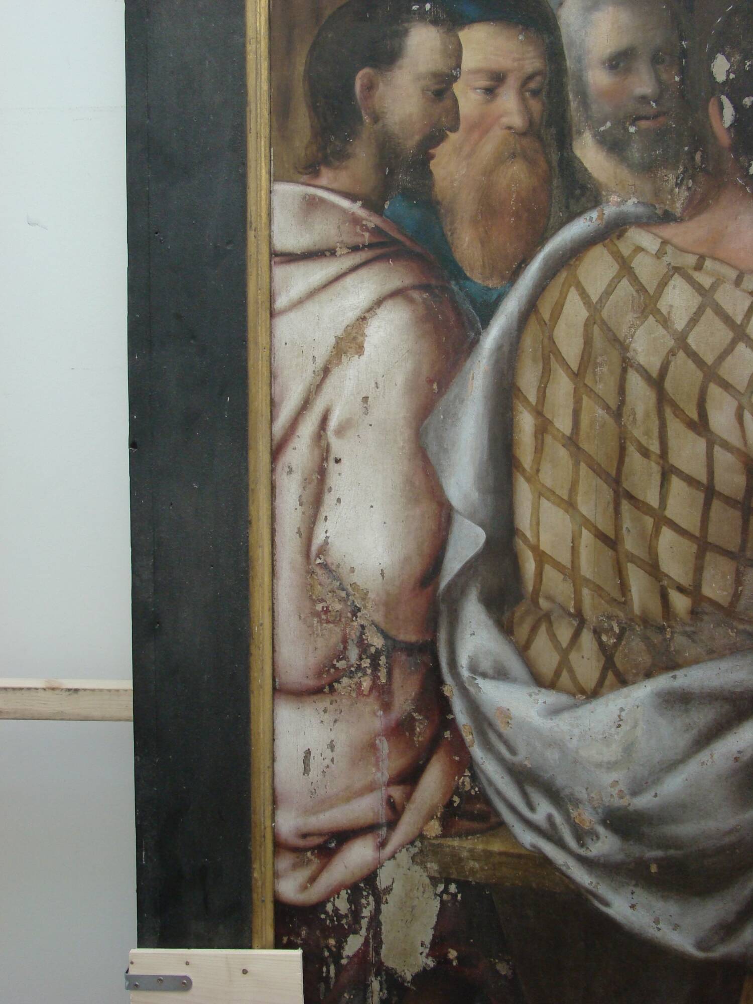Le tableau disparaissait presque sous la poussière et un vernis noirci. Il présentait un beau échantillonnage des altérations pouvant toucher la couche picturale : soulèvements, craquelures, écailles, chanci, repeints disgracieux. Un nettoyage a permis non seulement d’arrêter une détérioration irréversible, mais aussi de révéler une inscription en bas à gauche : la signature du peintre Lucas Floquet (1578-1635) ainsi que la date de 1612.
