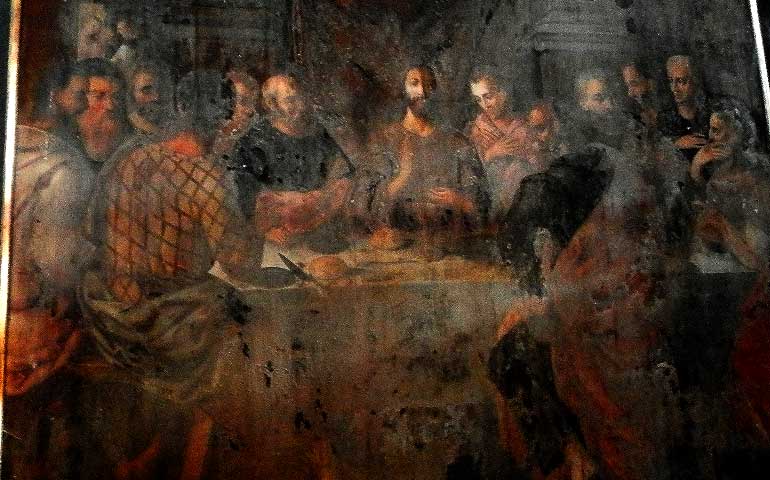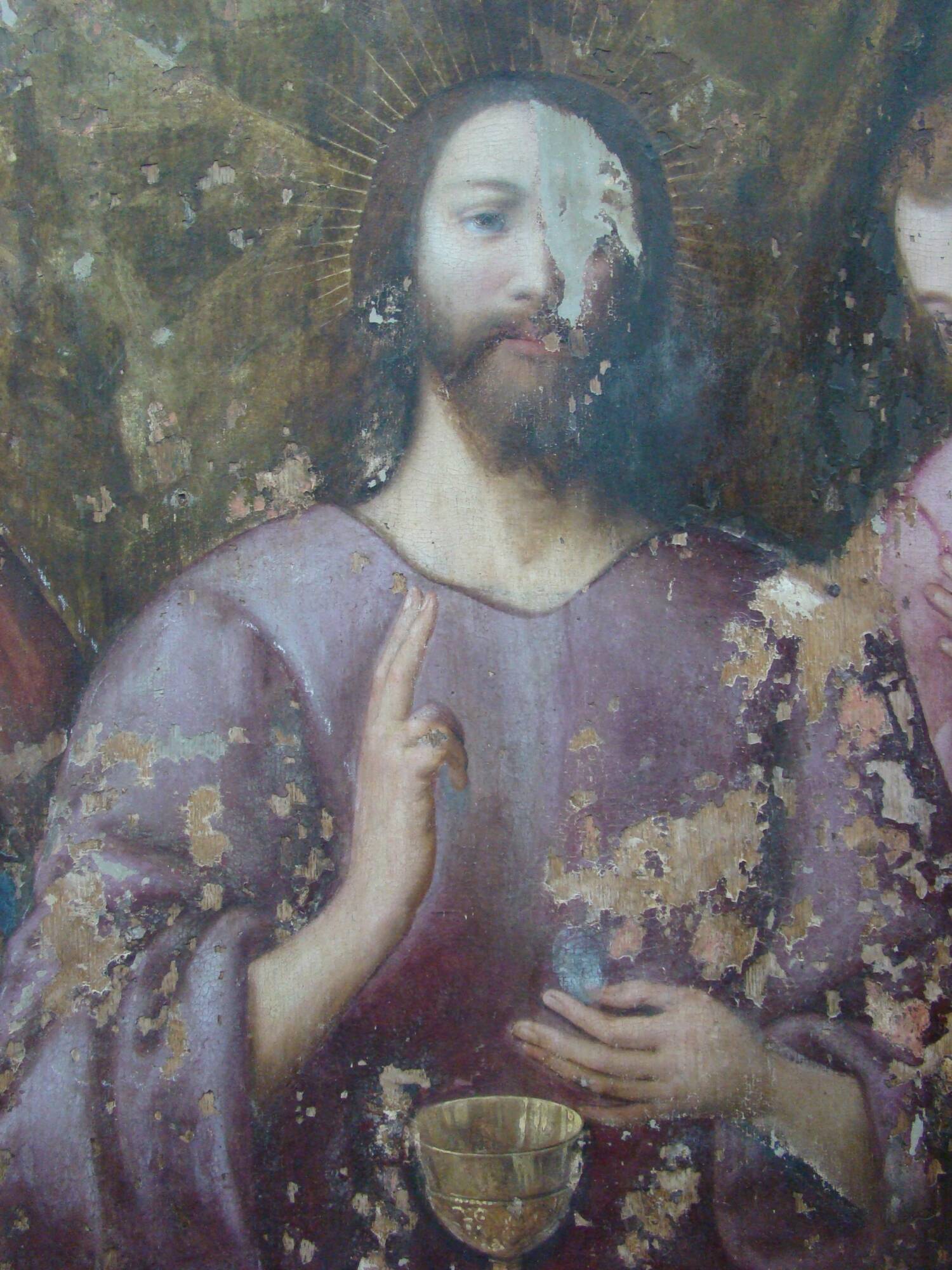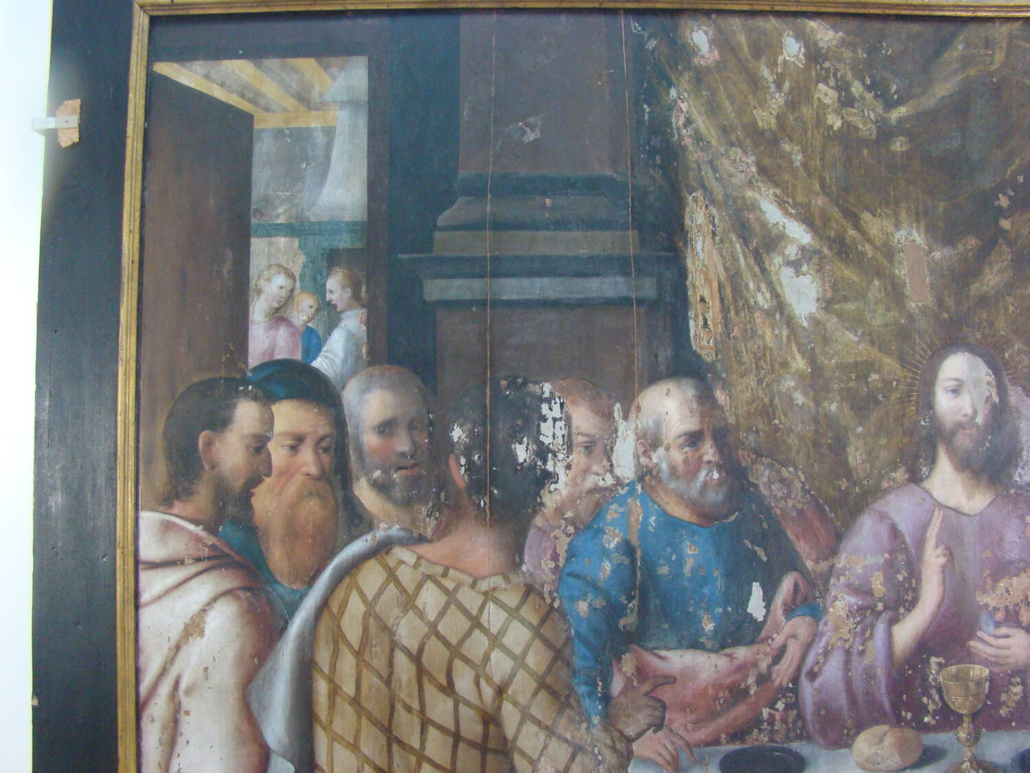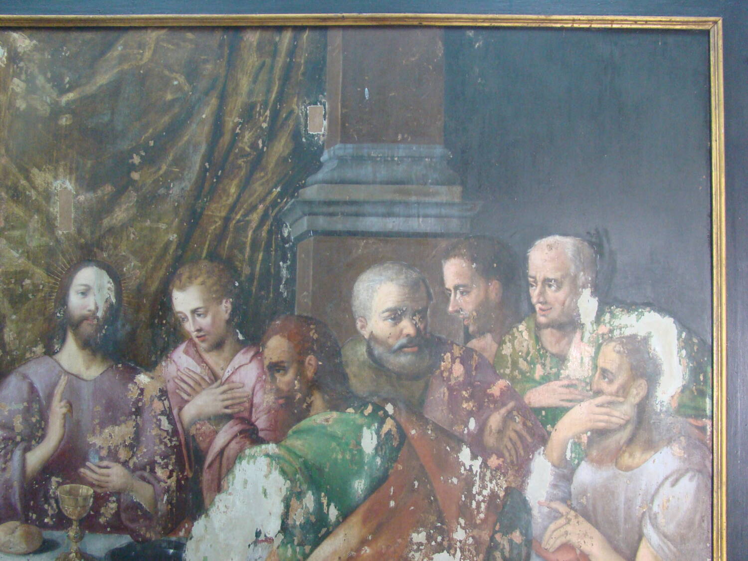 Le tableau disparaissait presque sous la poussière et un vernis noirci. Il présentait un beau échantillonnage des altérations pouvant toucher la couche picturale : soulèvements, craquelures, écailles, chanci, repeints disgracieux. Un nettoyage a permis non seulement d’arrêter une détérioration irréversible, mais aussi de révéler une inscription en bas à gauche : la signature du peintre Lucas Floquet (1578-1635) ainsi que la date de 1612.