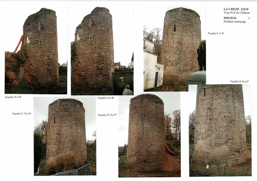 Cette tour a été entièrement reprise en chemisant partiellement les restes après dommages, vues les meurtrières sans ouverture ronde et base, probablement au XIIIème ou au début du XIVème siècle, puisque déjà au milieu du XIVème siècle les meutrières avec ouverture ronde en base apparaissent.